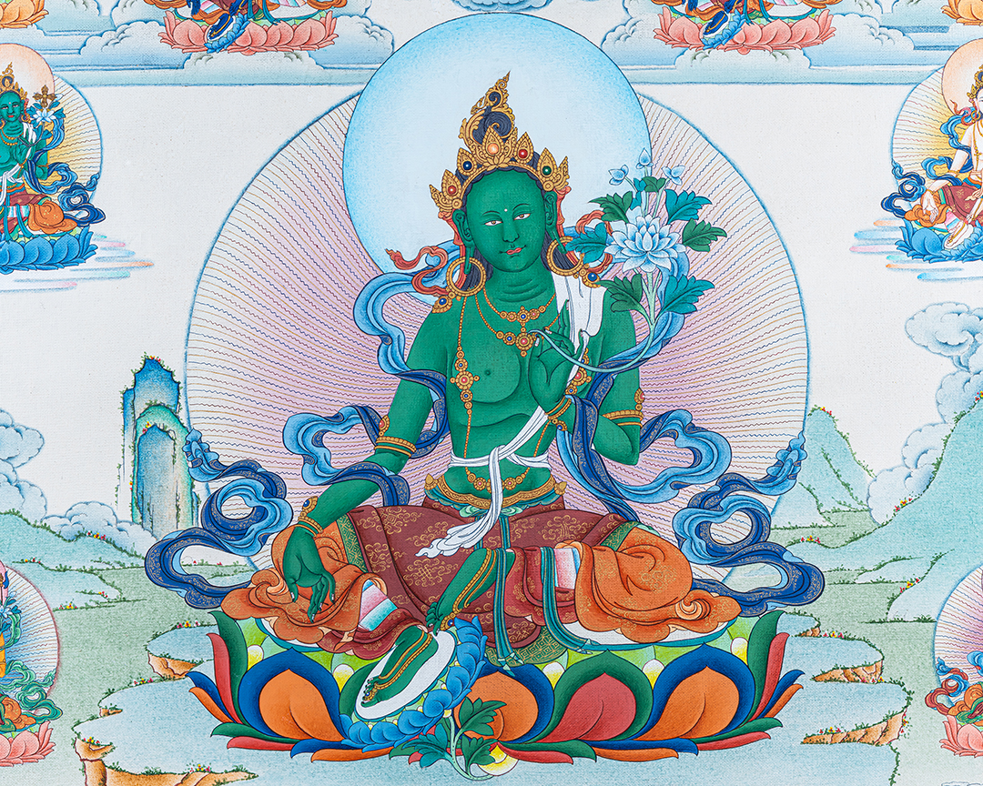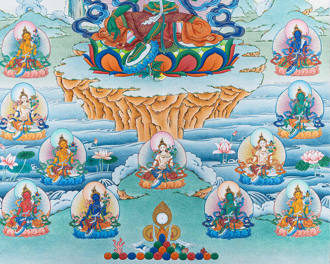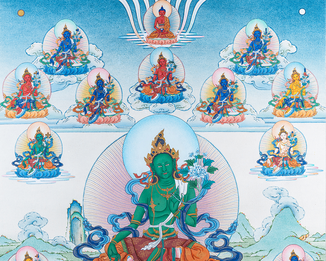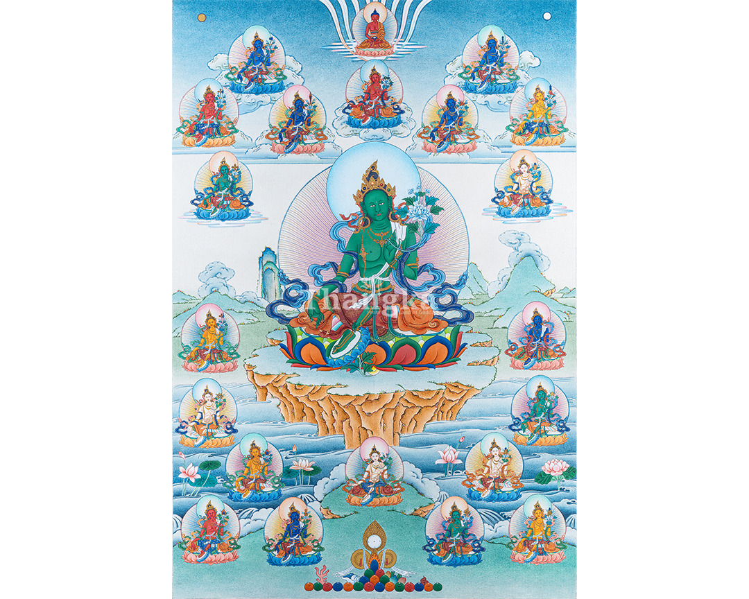 The 21 Taras are a group of female deities associated with various aspects of enlightened behavior. They are usually seen executing various mudras (symbolic hand gestures) while seated on lotus thrones in traditional Buddhist thangka paintings. Each of the 21 Taras is supposed to have special qualities and skills, and they are each associated with a different hue.