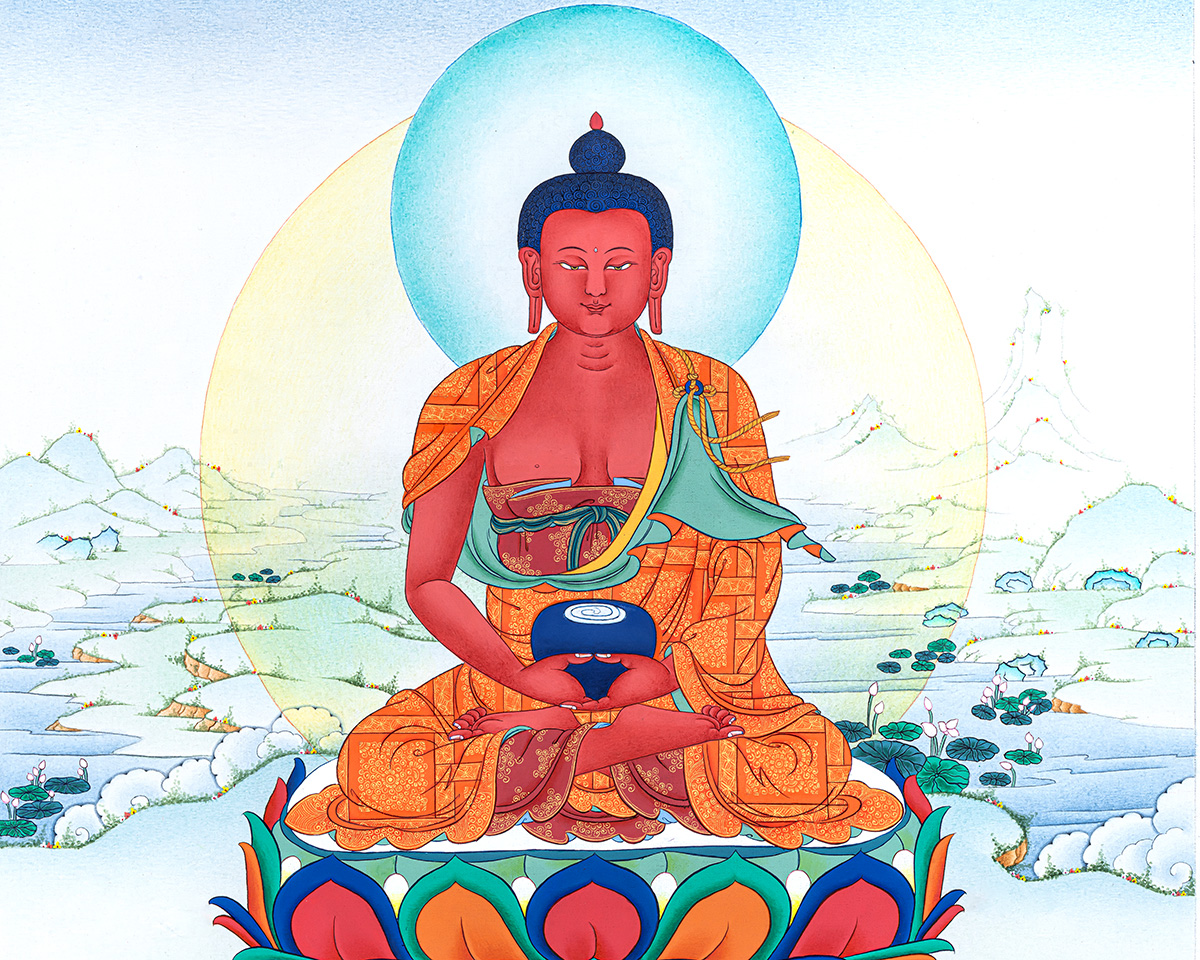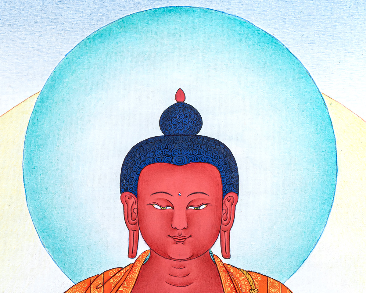 In Traditional Himalayan Thangka Art, Amitabha Buddha is depicted with a serene red complexion, seated in deep meditation with hands in the Dhyana Mudra. In Buddhist Thangka Painting, his image symbolizes wisdom, compassion, and the aspiration for rebirth in the Pure Land.