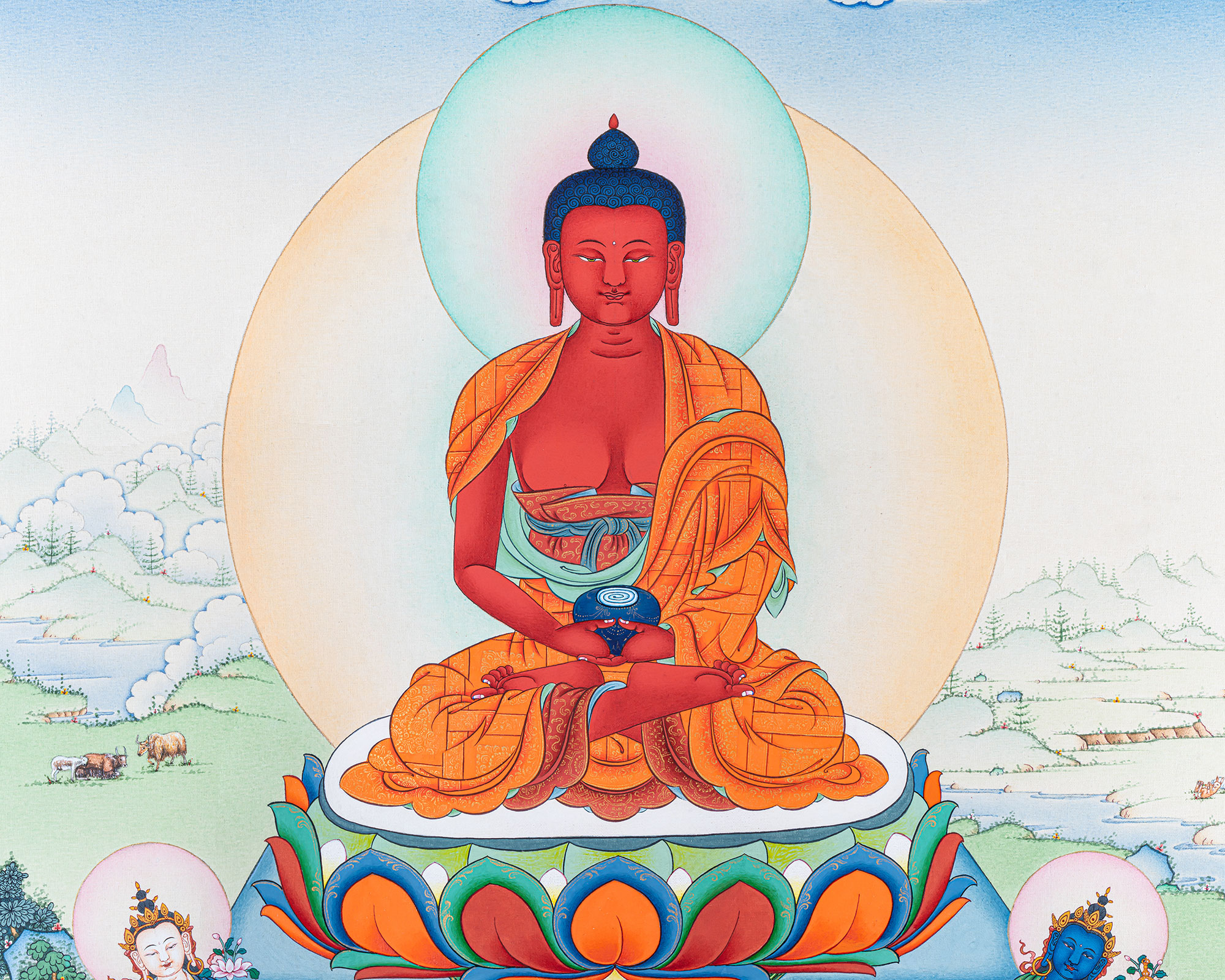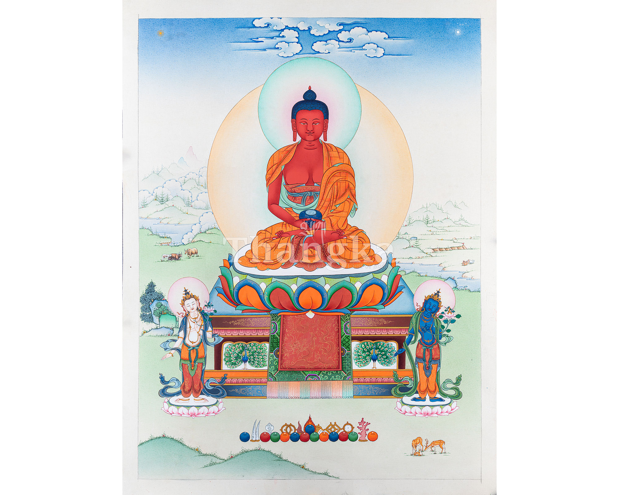 This Authentic Amitabha Buddha Thangka beautifully portrays Amitabha Buddha accompanied by the peaceful forms of Vajrapani and Chenrezig, symbolizing the perfect union of wisdom, compassion, and spiritual power.