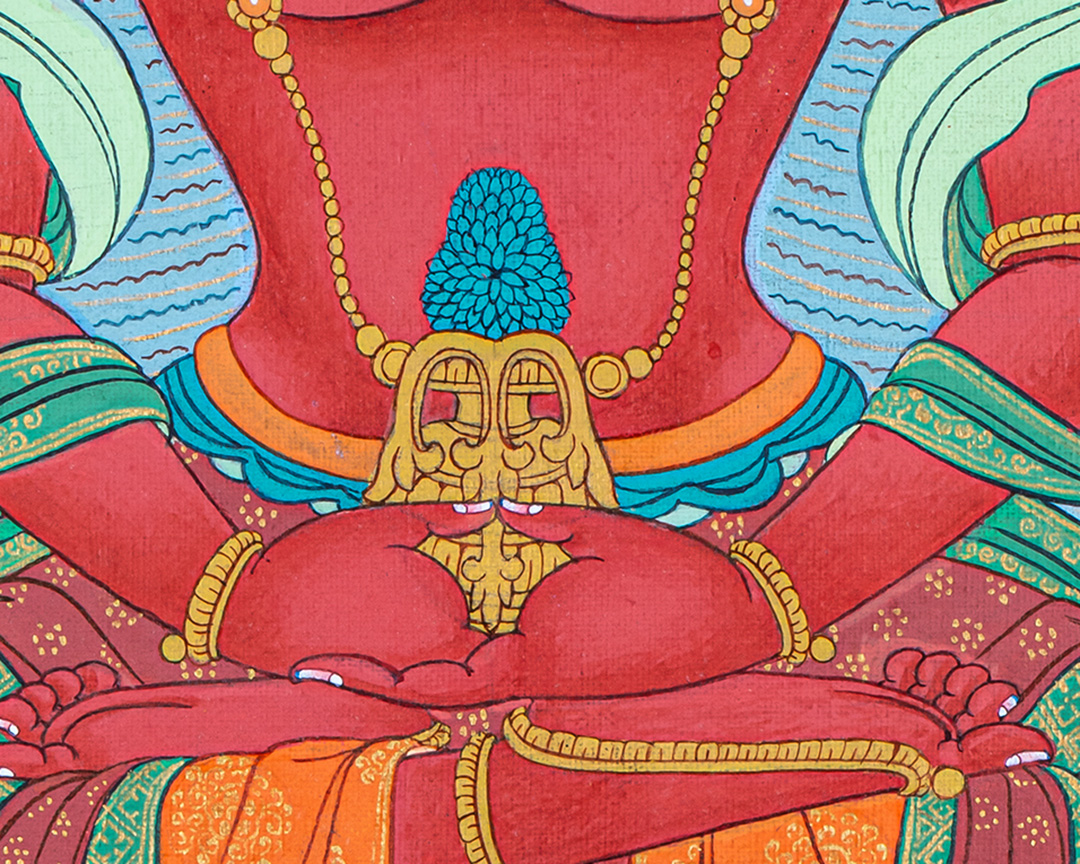In traditional Buddhist art, Amitayus is portrayed in radiant red color, seated in deep meditation on a lotus throne. He holds the Long-Life Vase (Kalasha)—a sacred vessel filled with the nectar of immortality. This vase symbolizes healing, rejuvenation, and the unbroken continuity of wisdom.
