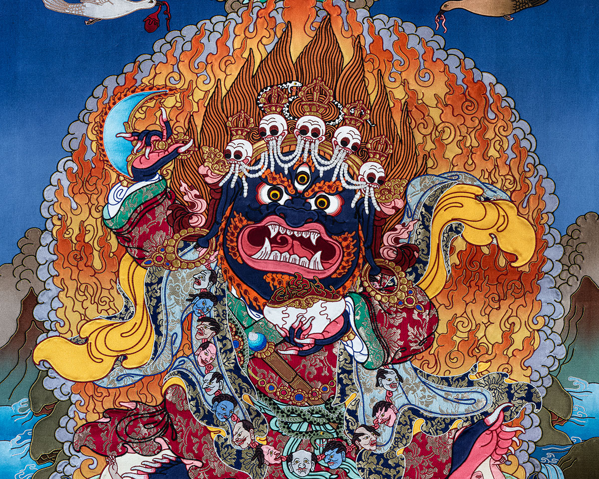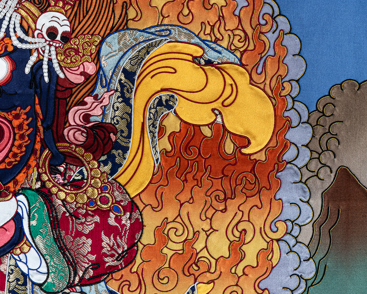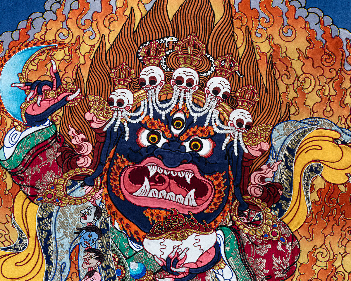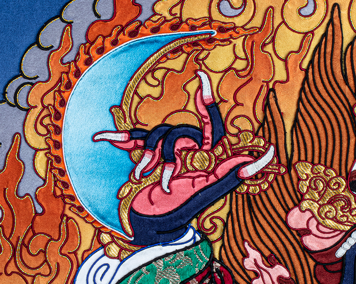 Unlike painted works, this handmade Tibetan Thangka is created through a complex process of stitching silk and brocade fabrics into detailed sacred forms, making it a unique expression of Buddhist Thangka art. Bernagchen Mahakala is depicted in a wrathful form, symbolizing the destruction of obstacles, protection from negative forces, and the safeguarding of spiritual practice.