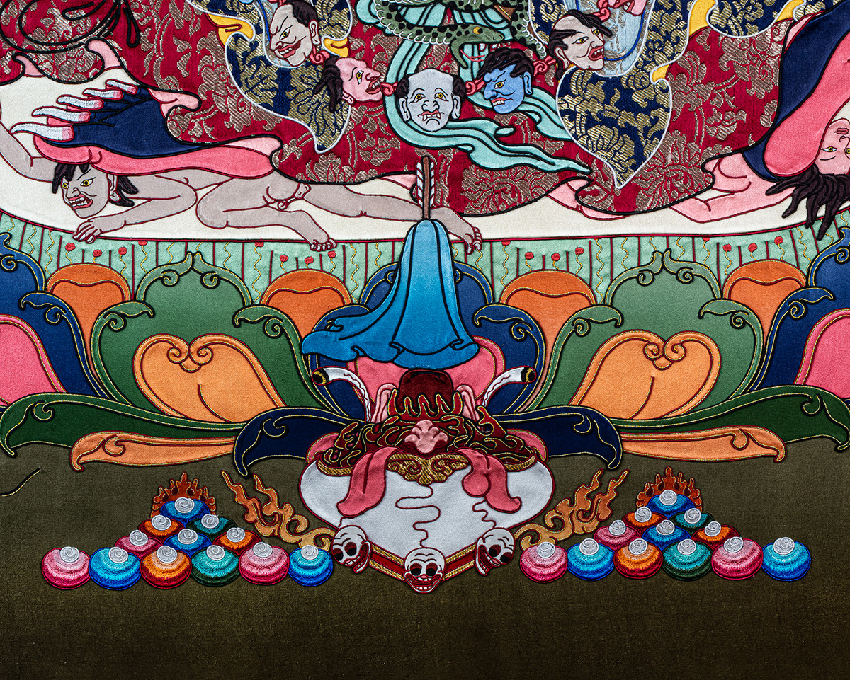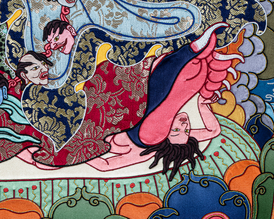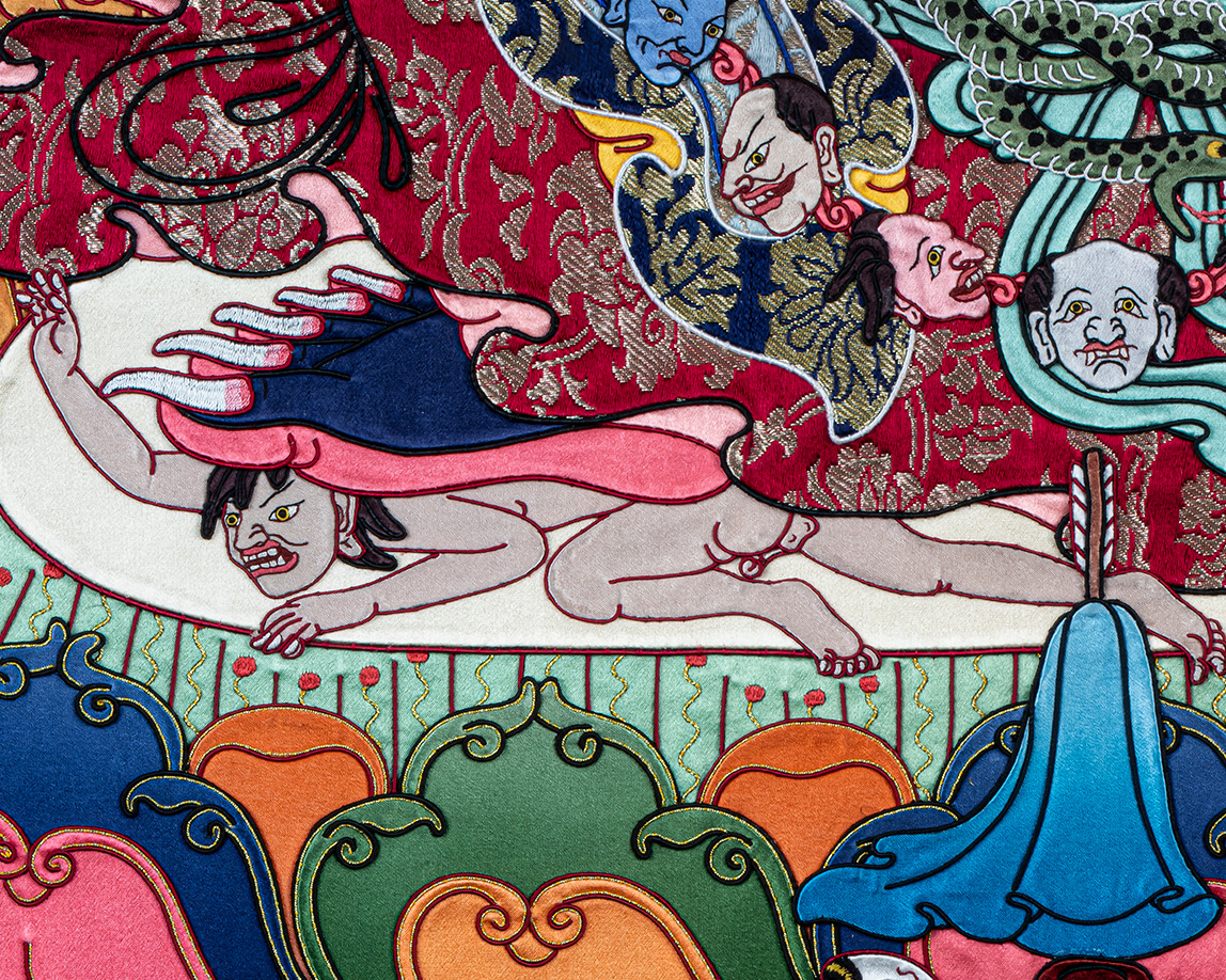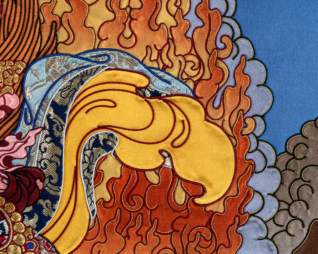 This appliqué thangka embodies the essence of authentic Himalayan Buddhist art, combining devotion, craftsmanship, and spiritual symbolism. Such original Tibetan Thangka artwork is highly valued by collectors, monasteries, and practitioners for both ritual use and sacred display.