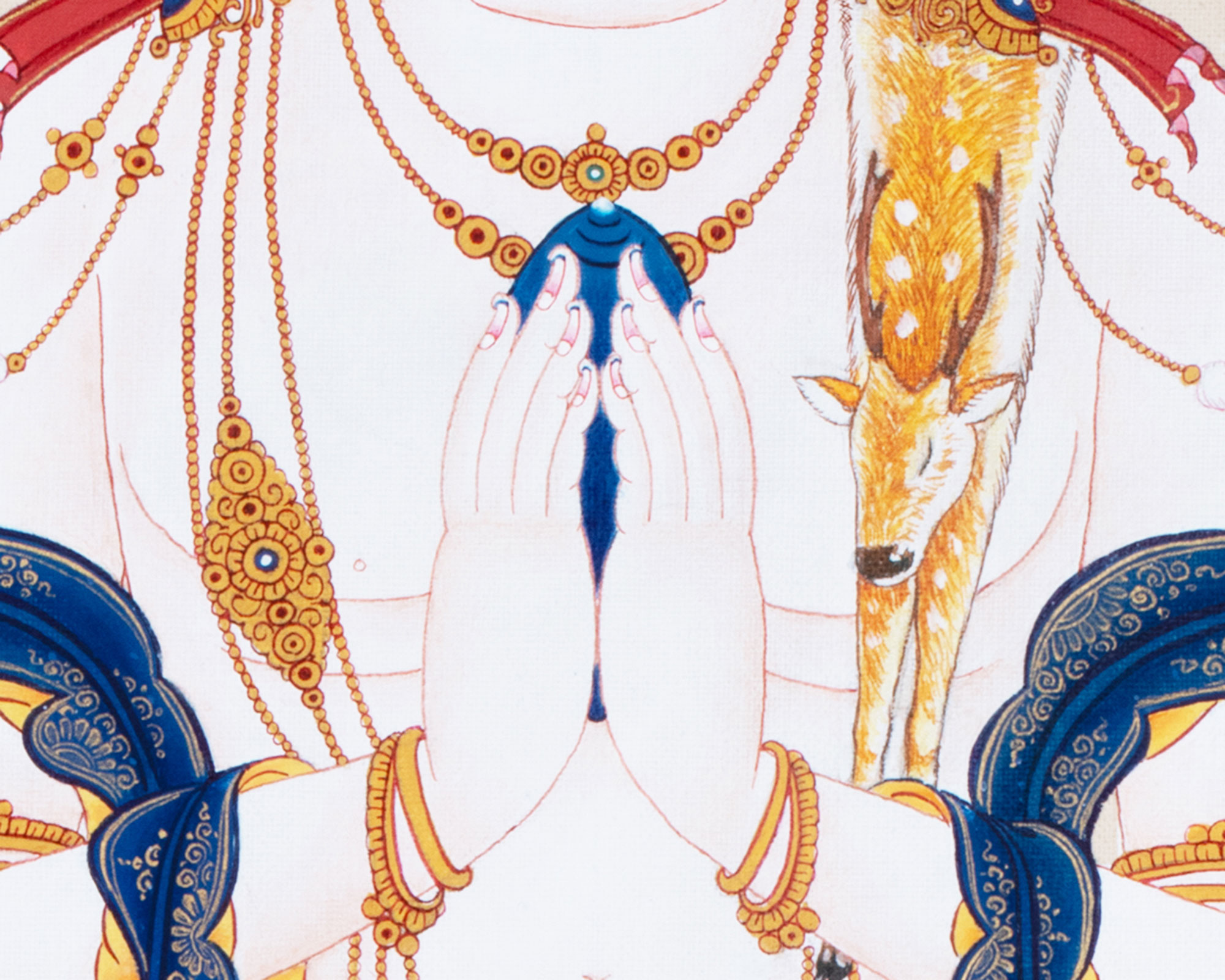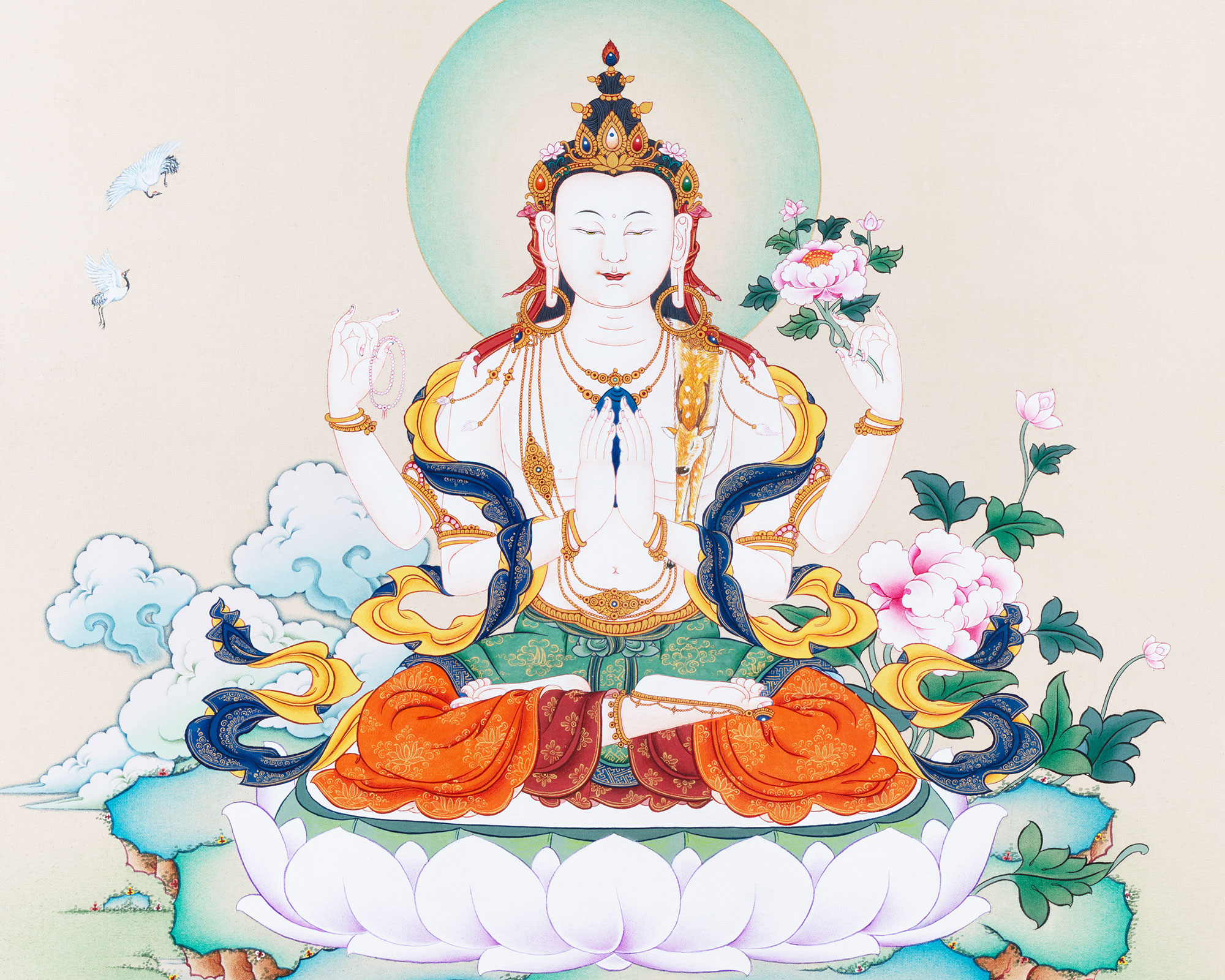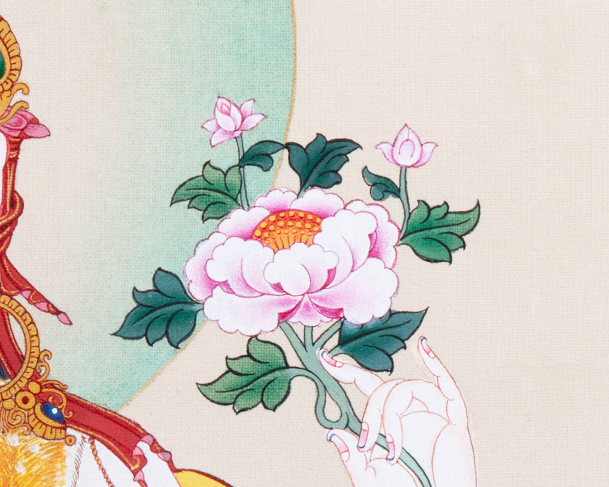 Hand-painted in the traditional Himalayan thangka style, this sacred artwork is ideal for home altars, meditation rooms, monasteries, and sacred art collections. Chenrezig is widely practiced through the mantra Om Mani Padme Hum, and this thangka serves as a powerful visual support for meditation, mantra recitation, and the cultivation of compassion. Its gentle and uplifting presence brings peace, blessings, and harmony into any space.