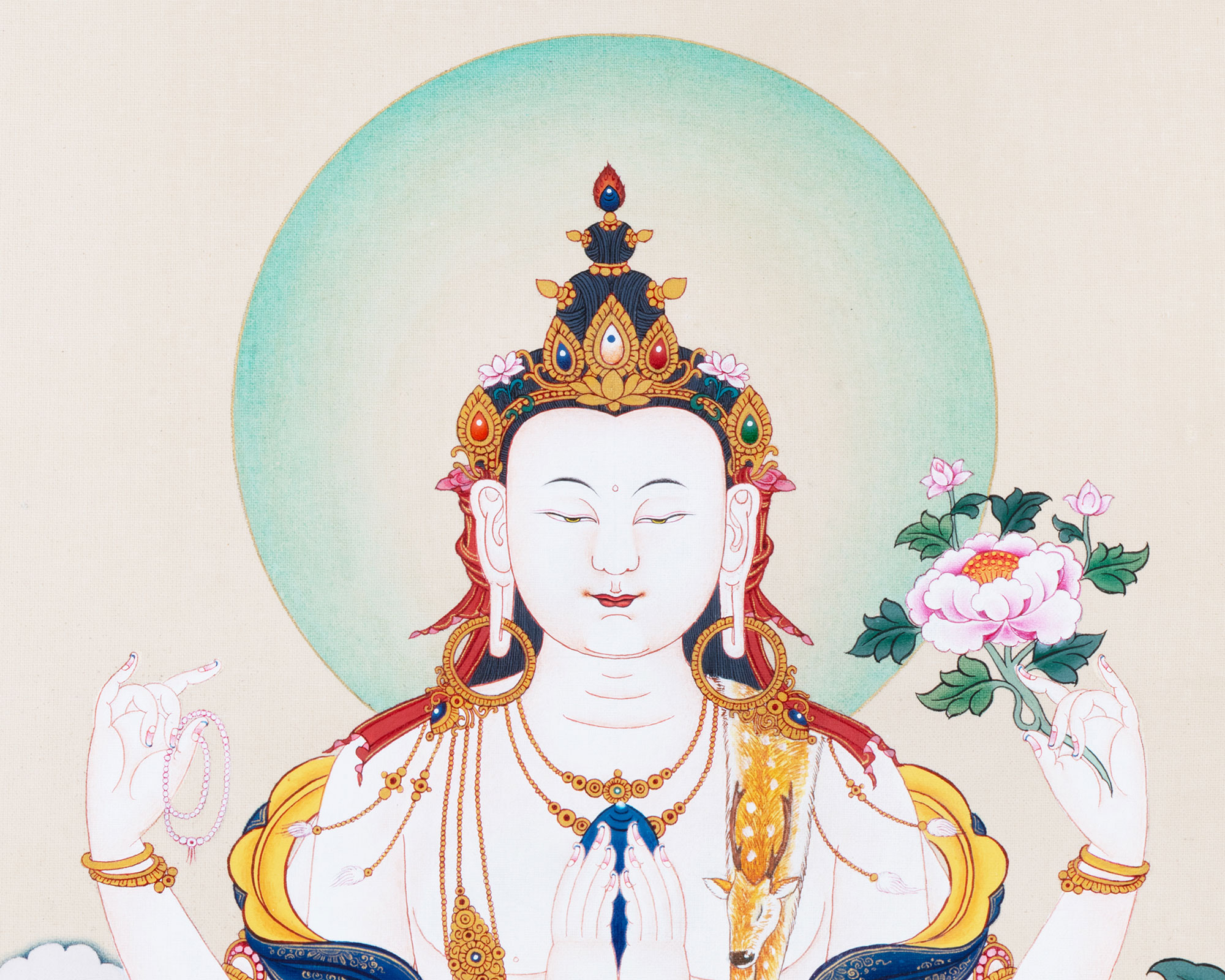This serene Chenrezig Thangka depicts Avalokiteshvara, the Bodhisattva of Compassion, who embodies the boundless mercy and loving-kindness of all Buddhas. Shown in his peaceful form, Chenrezig holds sacred symbols that represent compassion, wisdom, and skillful means, reminding practitioners of the path of altruism and awakening. His calm and radiant presence inspires kindness, patience, and deep inner peace.
