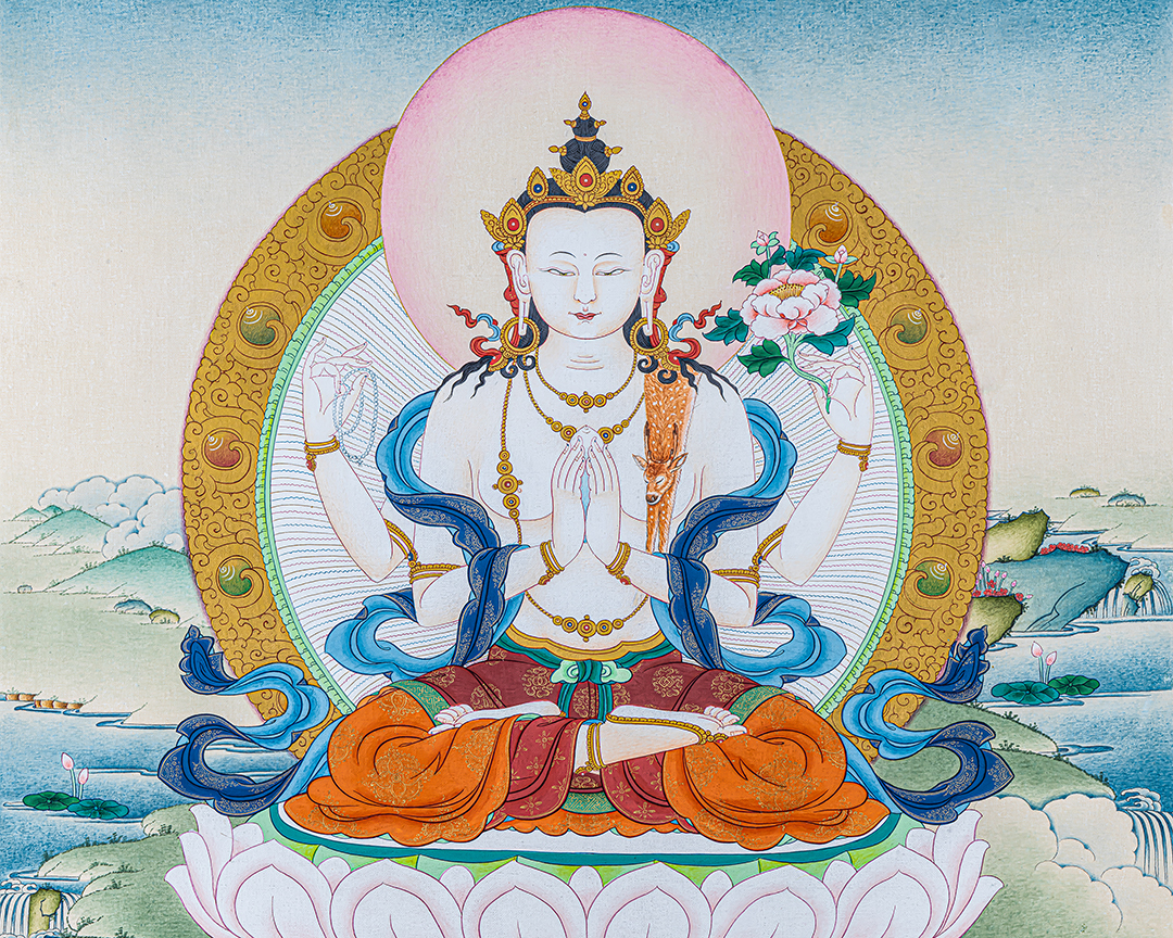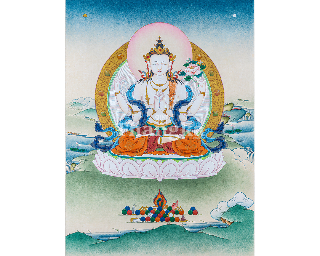 Chenrezig Thangka Painting I Deity of Compassion, Gold Accent