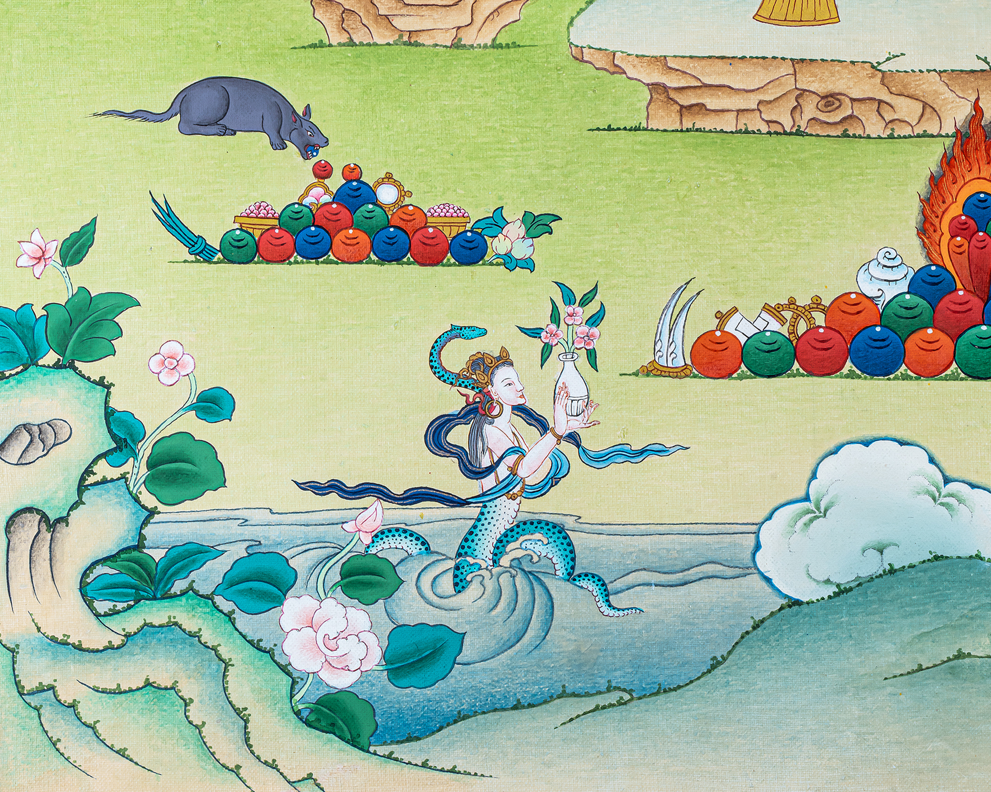 This hand-painted thangka uses traditional Tibetan techniques and vibrant natural pigments, making it not only a sacred tool for meditation and rituals but also a stunning piece of home décor. Perfect for devotees seeking prosperity, good fortune, and spiritual blessings, this thangka brings both beauty and positive energy into any space.