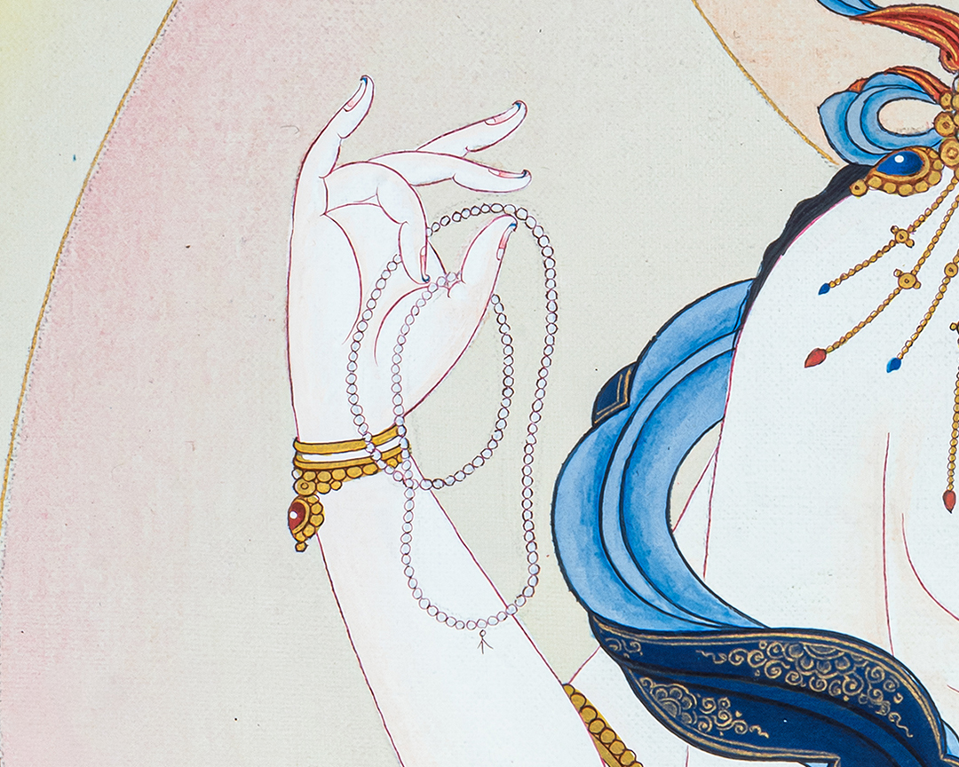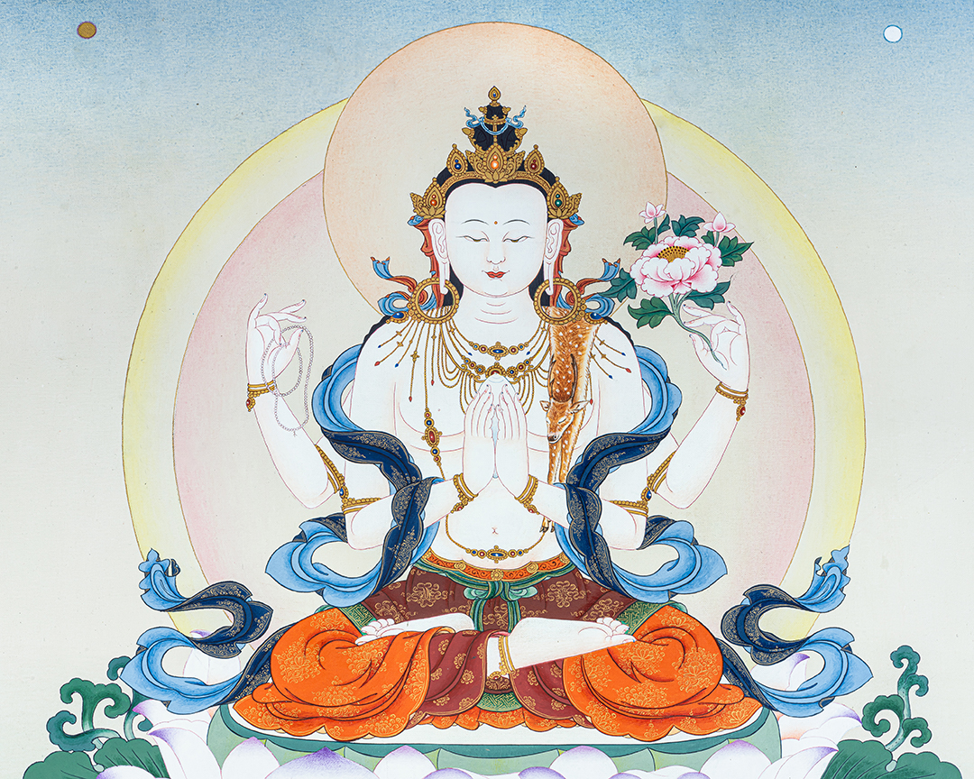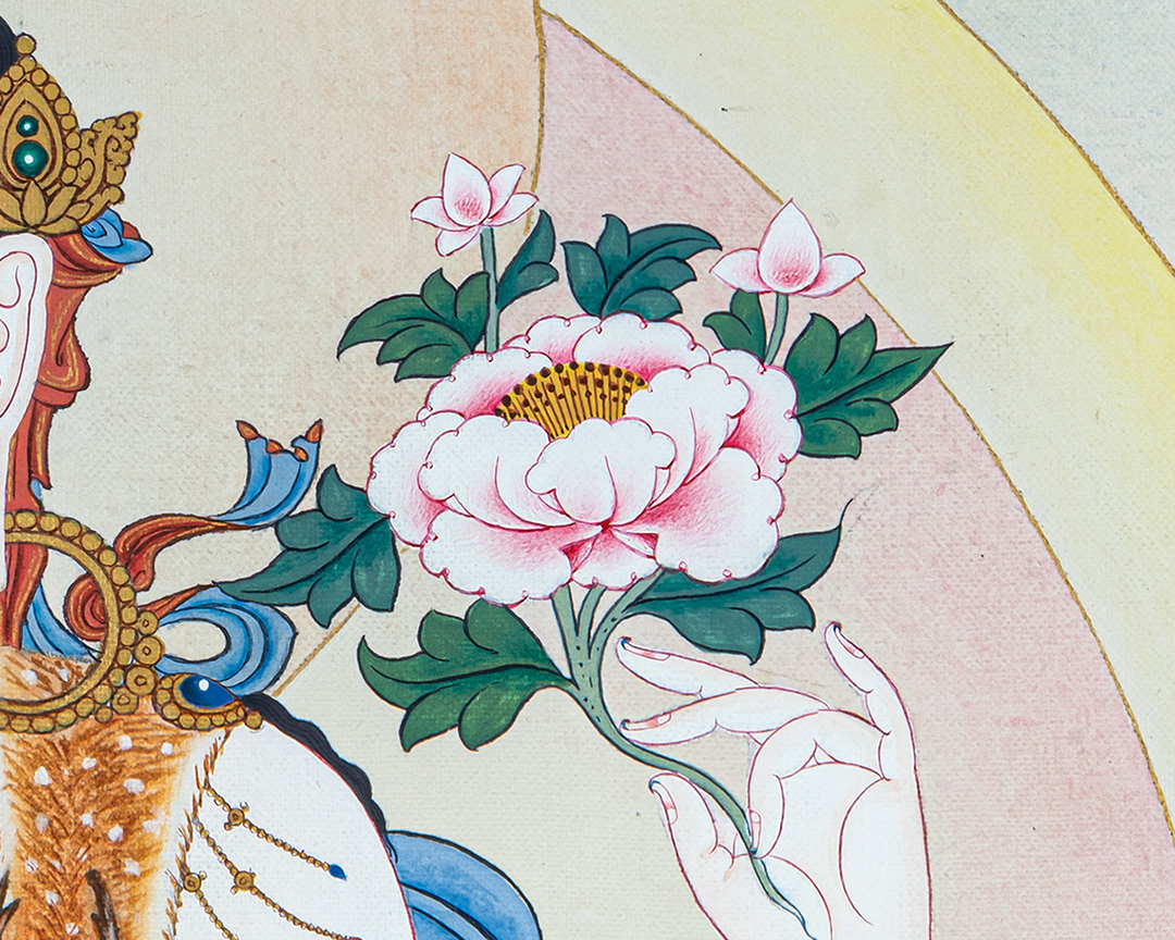 This exquisite thangka depicts Four-Armed Chenrezig (Avalokiteshvara), the Bodhisattva of Infinite Compassion, seated gracefully upon a fully bloomed lotus (Pema) rising from serene waters. His luminous white body symbolizes purity, clarity, and unconditional compassion, while his calm and gentle expression radiates inner peace and loving-kindness. Chenrezig’s two principal hands are joined at the heart in Anjali Mudra, holding a wish-fulfilling jewel that represents the perfect union of wisdom and compassion. His other two hands hold a crystal mala, symbolizing continuous compassionate activity for all beings, and a lotus flower, signifying purity untouched by worldly suffering. The soft pastel tones, subtle halos, and flowing silk scarves enhance the sense of serenity and divine presence. The lotus seat, emerging from water, reflects spiritual awakening and the blossoming of compassion even within the cycle of samsara. The balanced composition and fine detailing follow traditional Tibetan thangka iconography, making this artwork both spiritually authentic and visually calming. Ideal for meditation spaces, personal shrines, or sacred interiors, this Four-Armed Chenrezig Thangka serves as a powerful support for compassion practice, mindfulness, and the recitation of Om Mani Padme Hum, while also standing as a timeless piece of sacred Himalayan art.