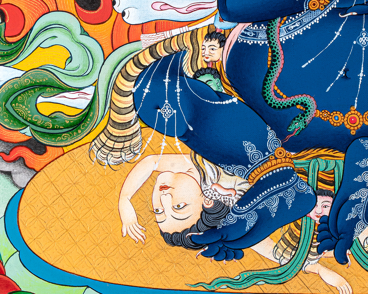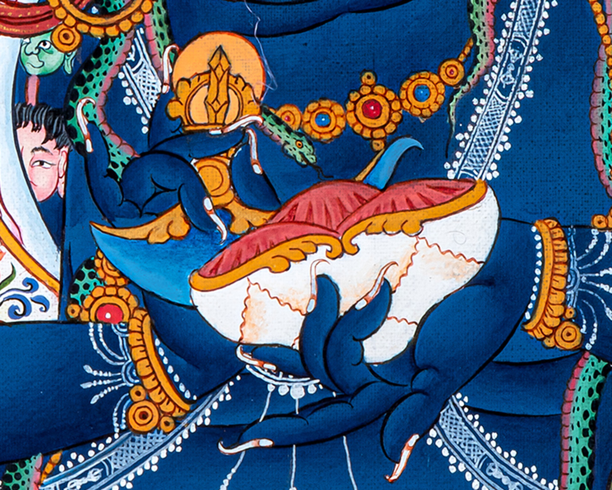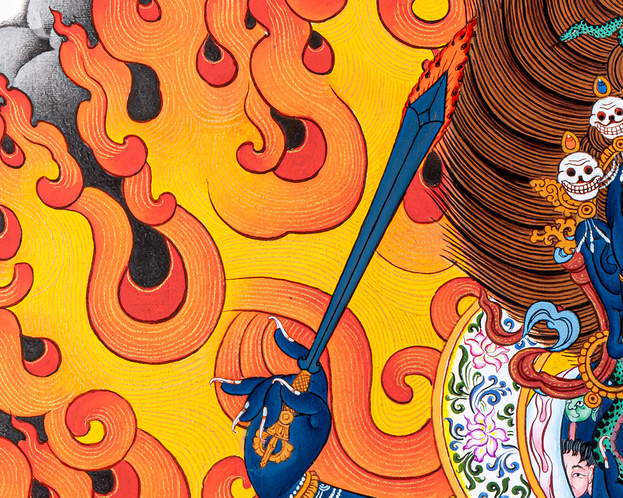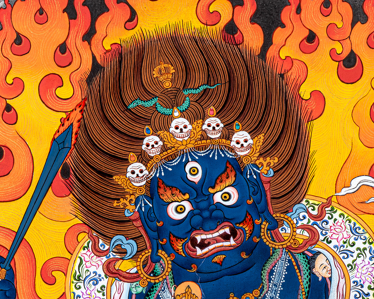 In Buddhist Thangka Painting, the four-armed form of Mahakala symbolizes his dynamic and all-encompassing power. Each of his hands holds sacred implements that represent the destruction of ego, attachment, and harmful influences. His wrathful expression signifies not anger, but the compassionate force needed to protect the Dharma and guide practitioners.