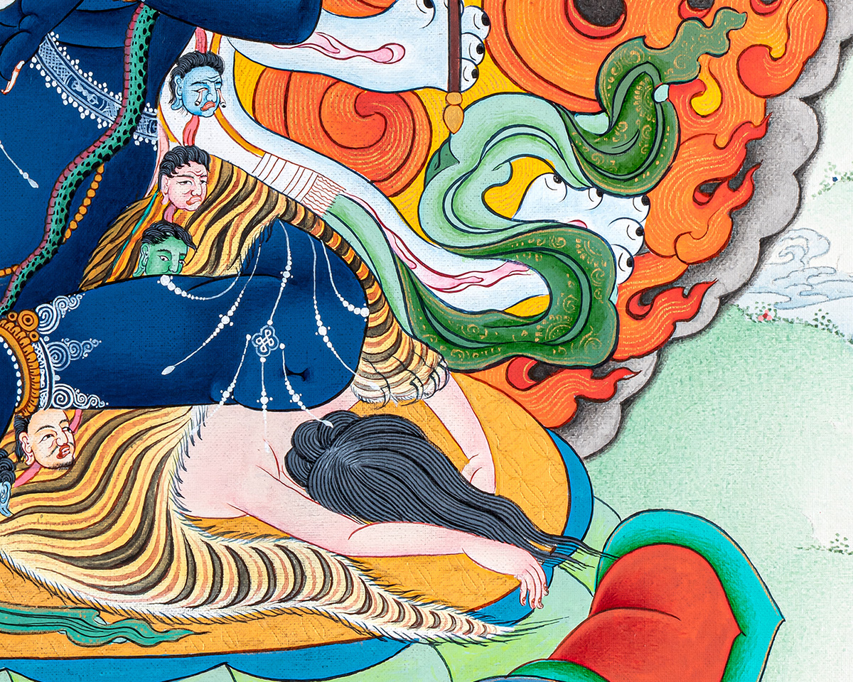 Mahakala is especially revered as a guardian deity, and his presence in Tibetan Buddhist Meditation Thangka practices is believed to offer protection, strength, and spiritual clarity.