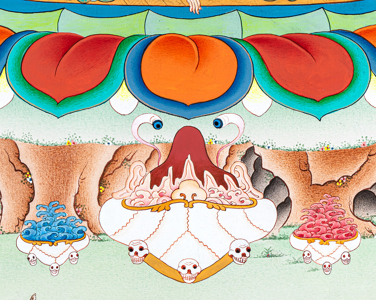 P.S. All thankas are painted taking references from Buddhist books following the correct iconography and by master artists, making it authentic traditional handmade Tibetan art. The subtle facial expression is one factor to distinguish the real effort put into creating this masterpiece.