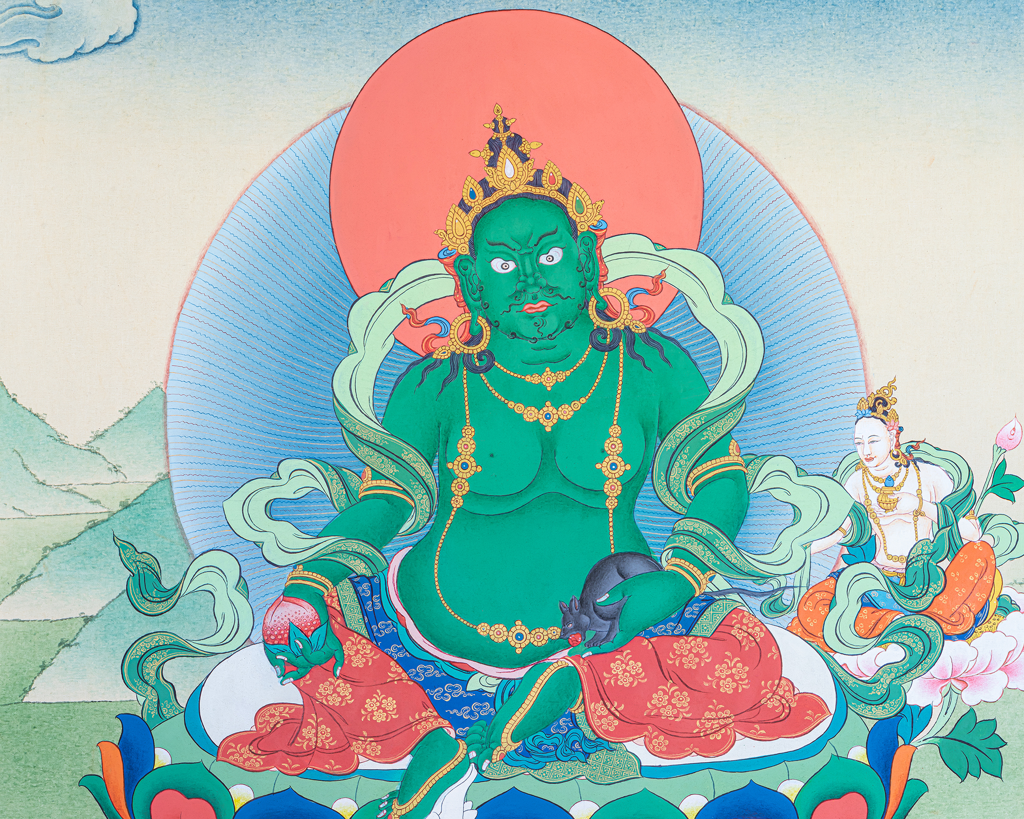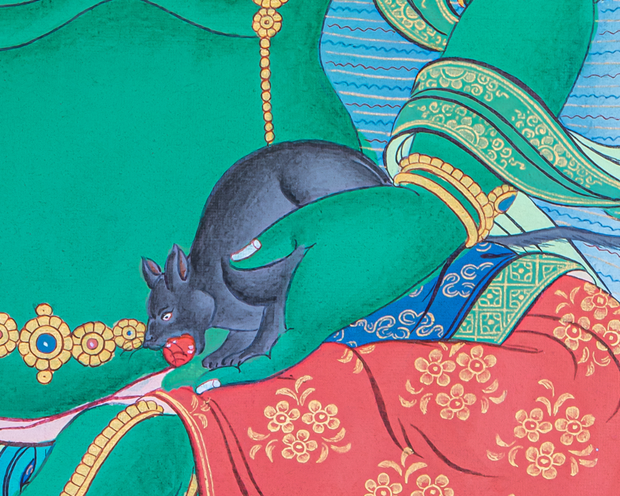 The Green Dzambala Thangka is a sacred Tibetan painting depicting Dzambala, the Wealth Deity, in his green form, symbolizing growth, vitality, and abundance. Seated gracefully on a lotus throne, Green Dzambala holds the treasure mongoose that sprinkles jewels, representing the removal of poverty and the flow of wealth and prosperity.