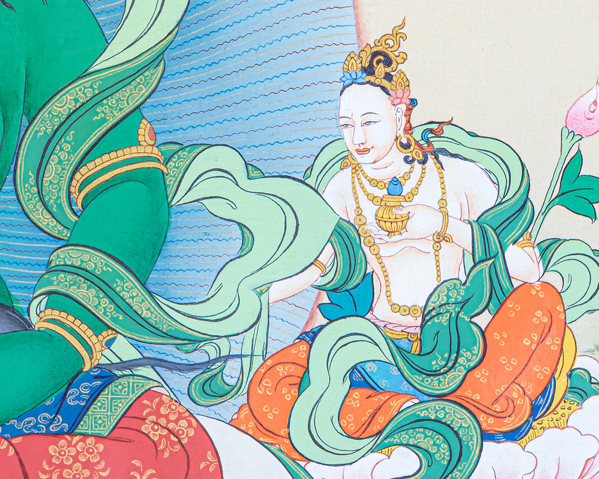 This thangka is meticulously hand-painted by skilled Tibetan artisans using traditional techniques and vibrant natural pigments, capturing every detail of the deity’s divine aura and intricate garments. Green Dzambala is particularly associated with financial growth, protection from misfortune, and the cultivation of generosity, making this thangka an ideal tool for meditation, altar offerings, or spiritual practice.