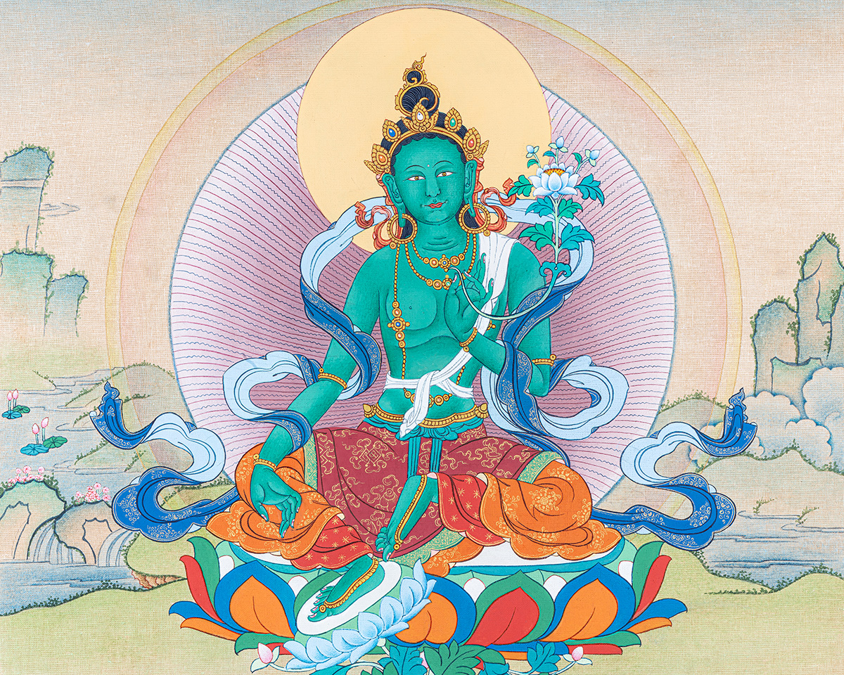 This Authentic Green Tara Thangka depicts Green Tara, the compassionate female deity revered for her swiftness in protecting devotees and removing obstacles. Green Tara, seated gracefully on a lotus throne, symbolizes both serenity and active intervention, bringing courage, healing, and spiritual guidance.
