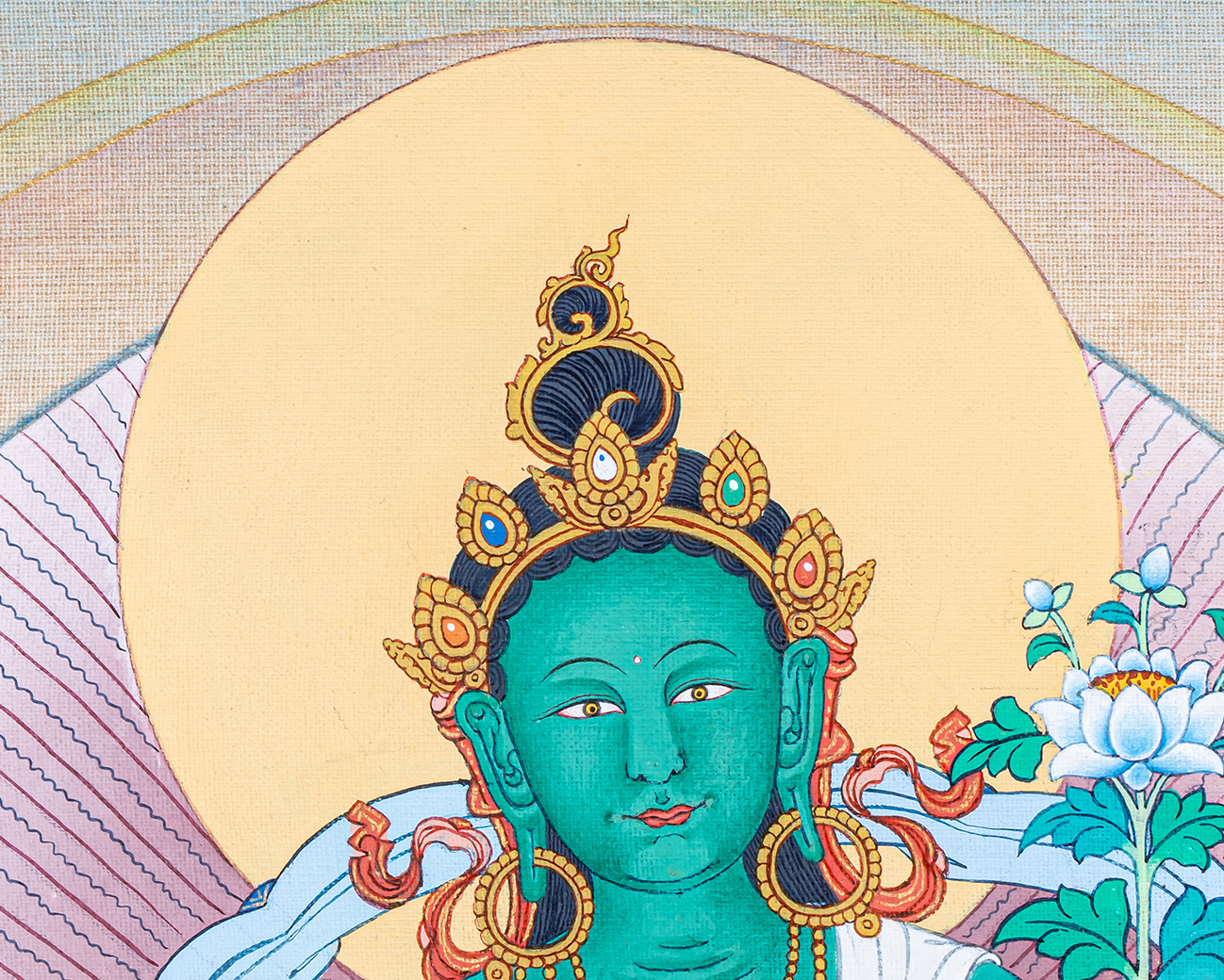 In Traditional Himalayan Thangka Art, her extended right leg reflects her readiness to help all beings, while her peaceful yet alert expression demonstrates the balance of compassion and wisdom. This Buddhist Thangka Painting is a profound tool for meditation, devotion, and spiritual practice.