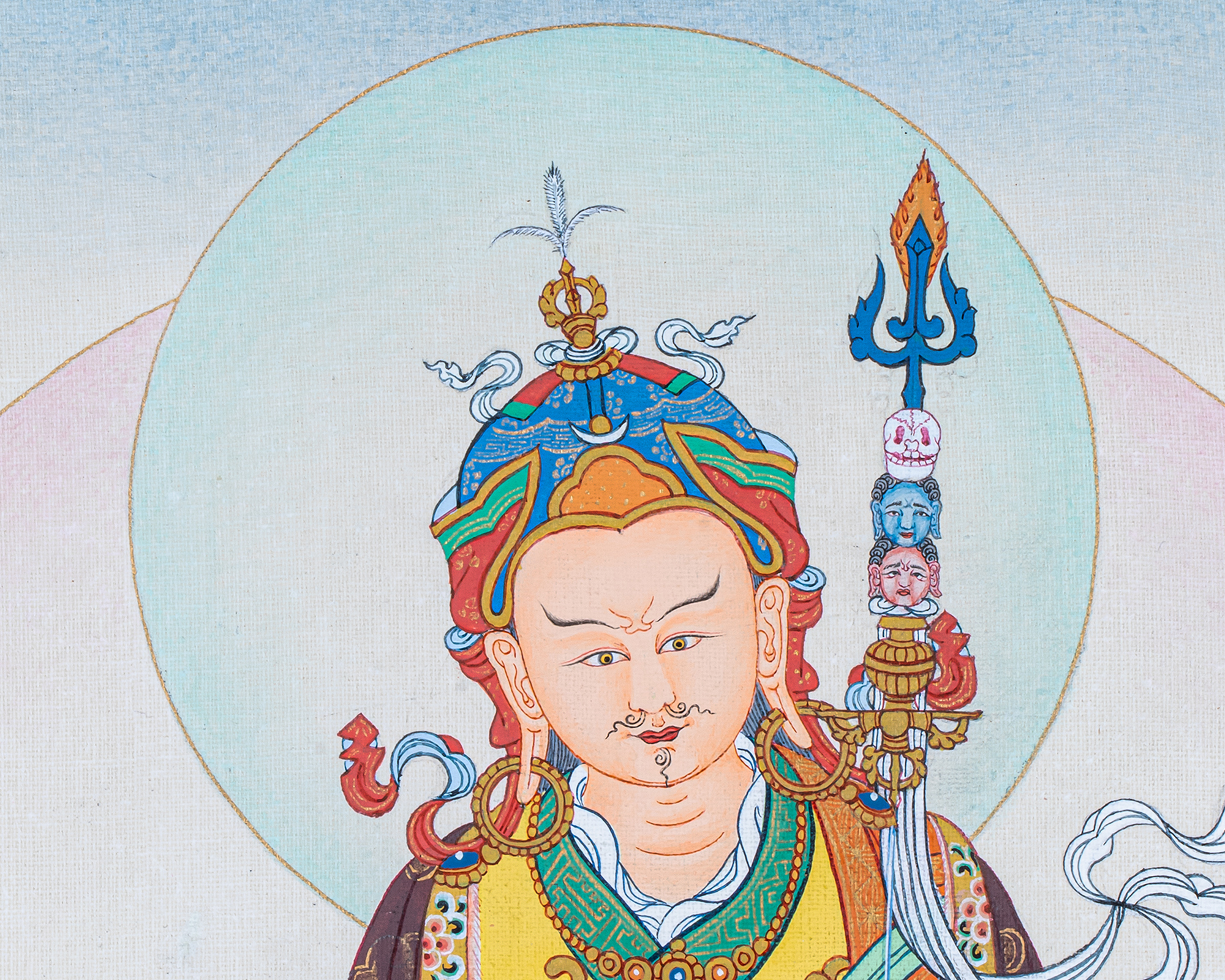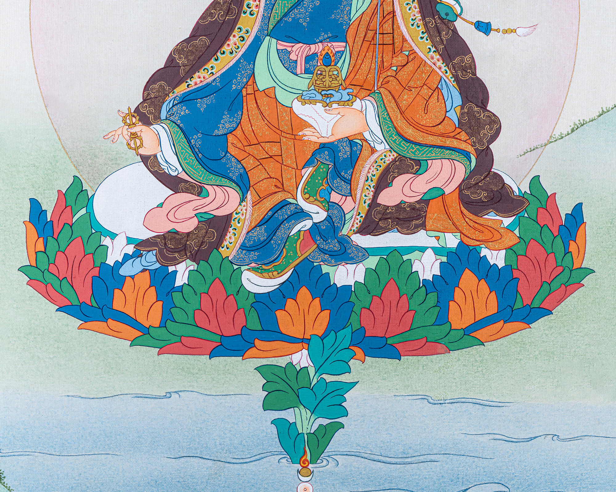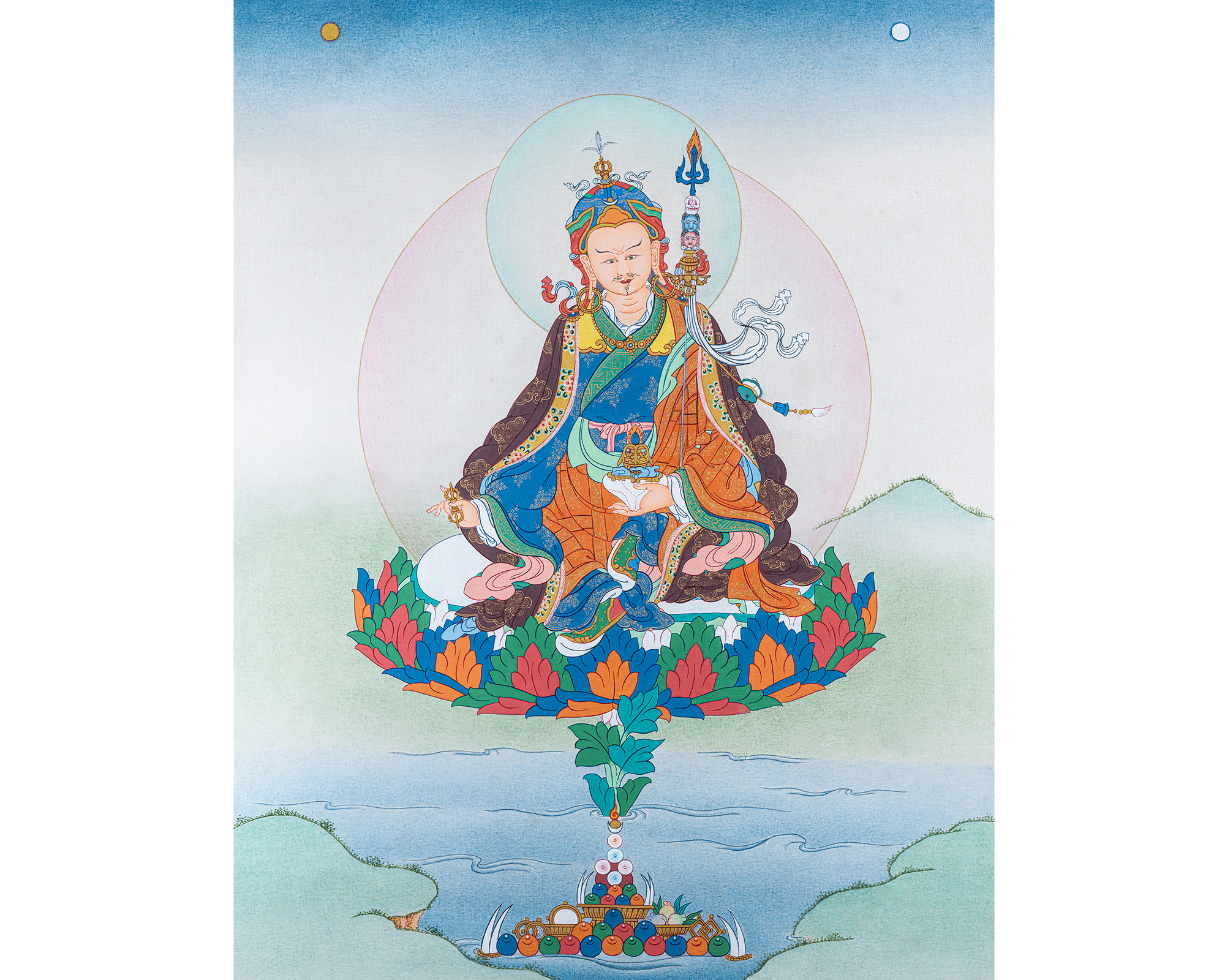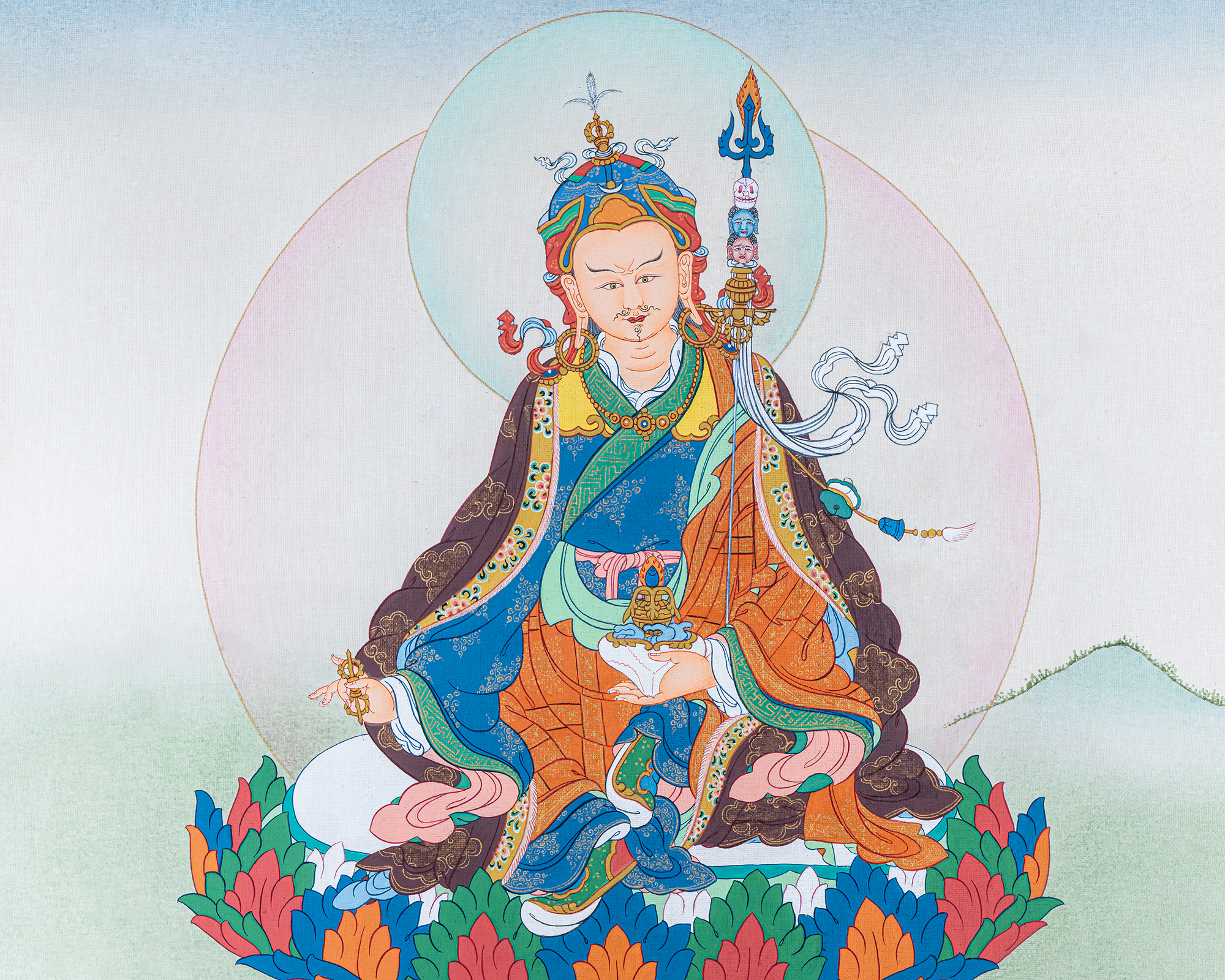 This sacred Guru Rinpoche (Padmasambhava) Thangka depicts the great Lotus-Born Master who established Vajrayana Buddhism in Tibet and the Himalayan regions. Seated in royal posture upon a lotus throne, Guru Rinpoche holds the vajra in his right hand and a skull cup (kapala) in his left, symbolizing indestructible wisdom and the transformation of ignorance into enlightenment. His khatvanga staff rests against his shoulder, representing the union of wisdom and compassion.