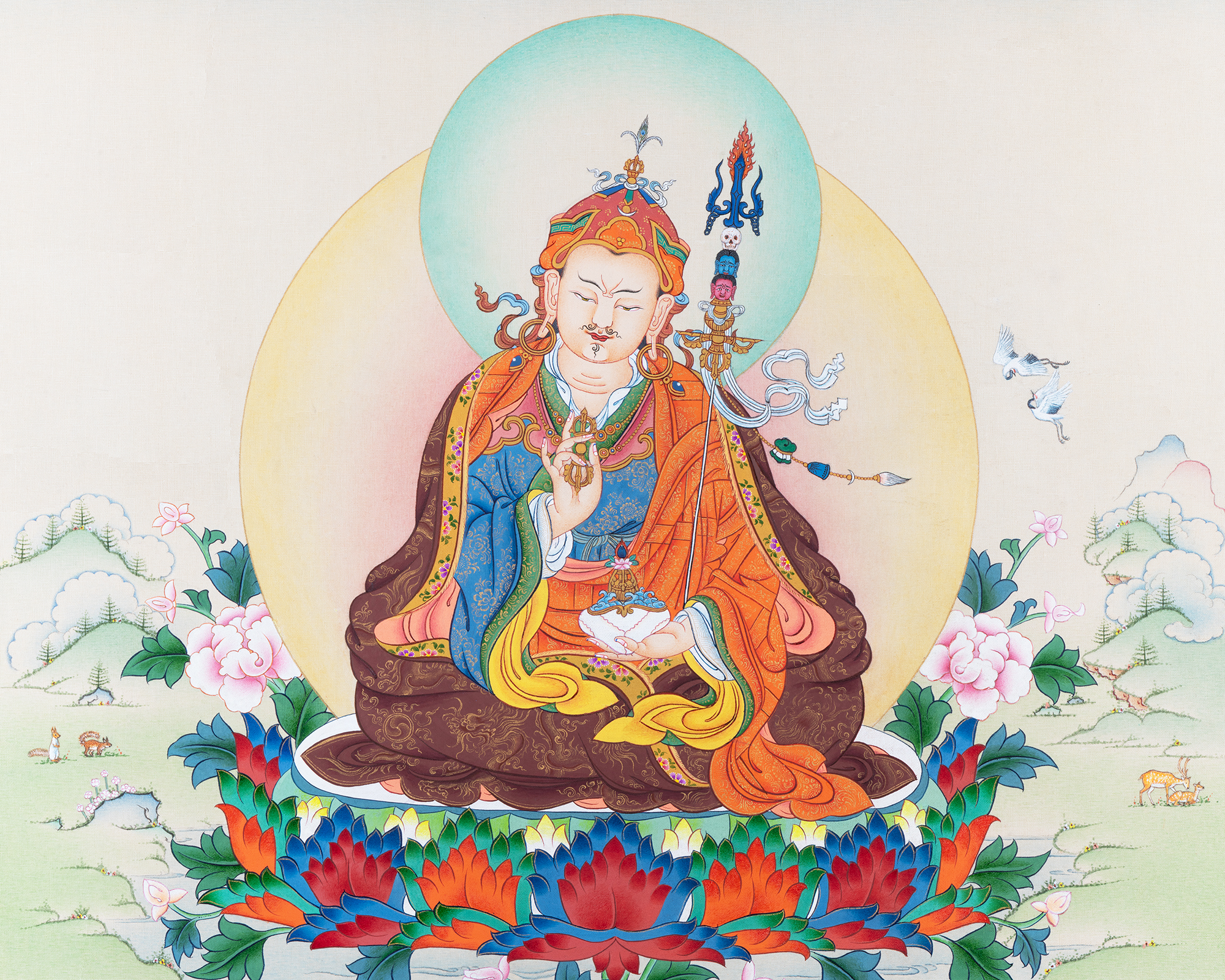 This exquisite Guru Rinpoche Thangka depicts Padmasambhava, the Lotus-Born Master who brought Vajrayana Buddhism to Tibet. Seated majestically on a lotus throne, he holds the vajra, skull cup, and trident, symbolizing his mastery over wisdom, method, and spiritual transformation. His radiant expression conveys compassion, fearlessness, and enlightened guidance, inspiring practitioners to overcome obstacles and attain spiritual realization.