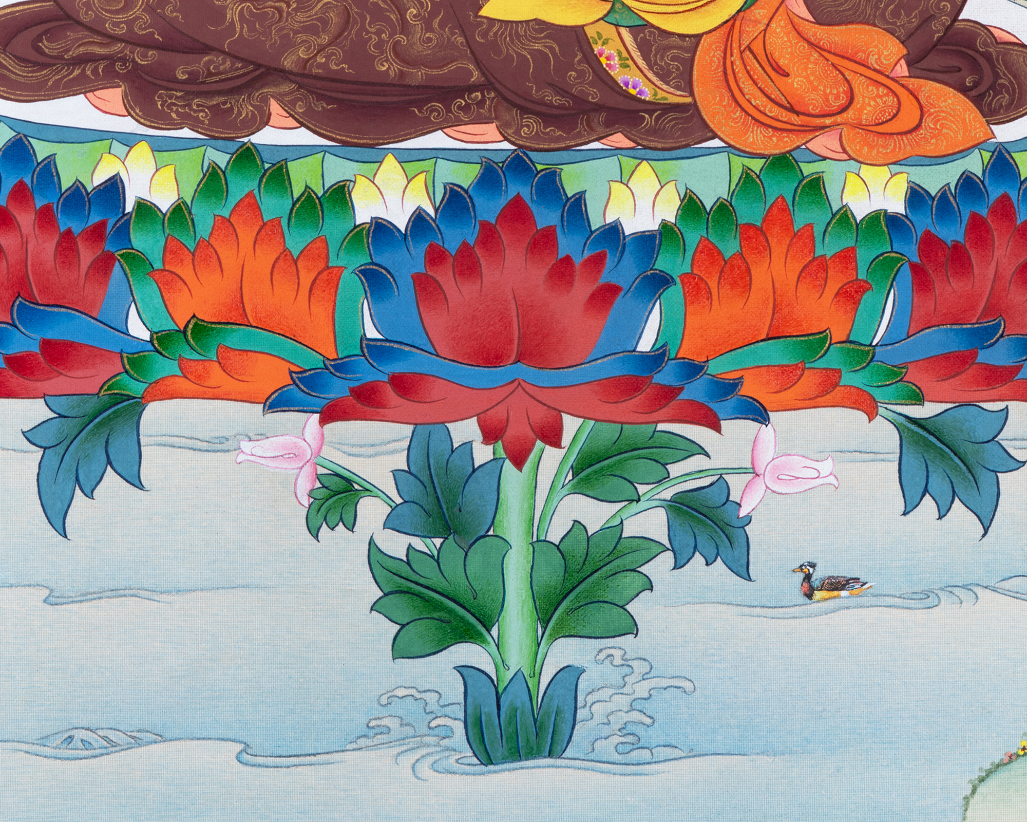 Hand-painted in the traditional Himalayan thangka style, this sacred artwork is ideal for home altars, meditation rooms, monasteries, and sacred art collections. Guru Rinpoche is especially revered for removing obstacles, empowering spiritual practice, and blessing devotees with courage and wisdom. This thangka serves as both a powerful devotional image and a visual support for meditation, prayer, and Vajrayana practice, bringing protection, inspiration, and spiritual energy into any space.
