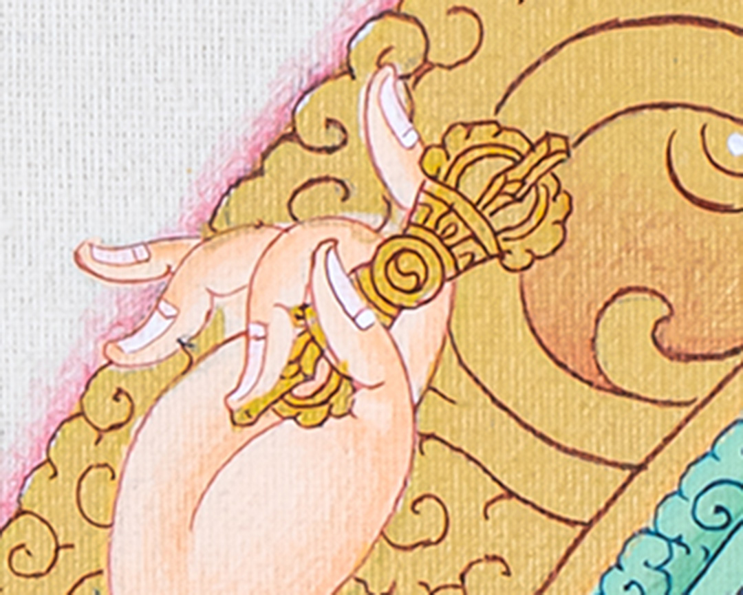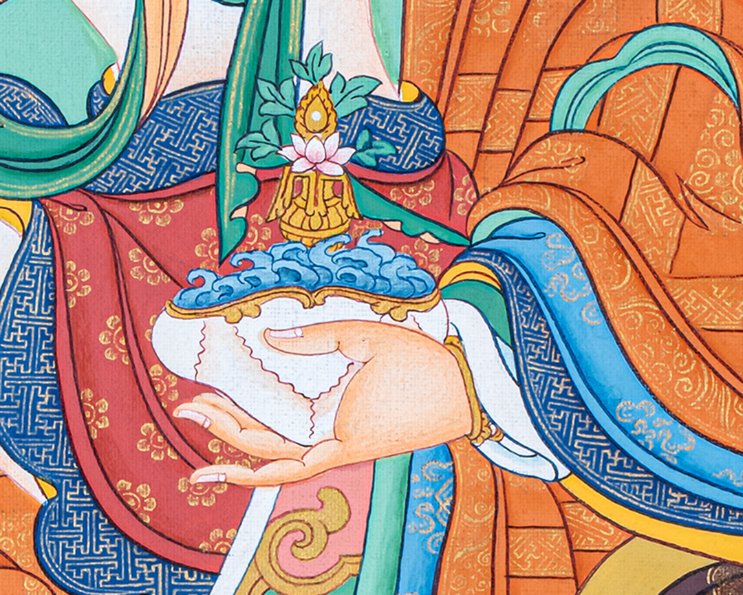 In this divine form, Guru Rinpoche sits in royal ease, radiating confidence and compassion. He holds the vajra, representing unshakable truth, and the skull cup, filled with the nectar of timeless wisdom. Resting against his shoulder, the Khatvanga signifies his mastery of the tantric teachings and the presence of the enlightened feminine. By his side, his consort—often depicted as Yeshe Tsogyal, the embodiment of pure wisdom—appears in graceful poise, adorned with celestial ornaments and holding symbolic implements that represent clarity, devotion, and the realization of the ultimate nature. Her serene yet powerful presence completes the sacred mandala of blessings.
