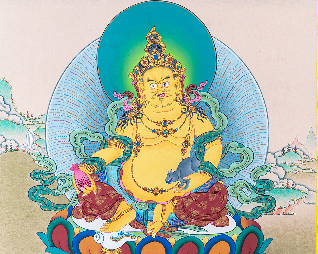 Through ceremonies, sacrifices, and reciting of Dzambala's mantra, "Om Jambhala Jalendraye Svaha," practitioners call upon his blessings. This is said to help clear the way for spiritual advancement as well as draw wealth.