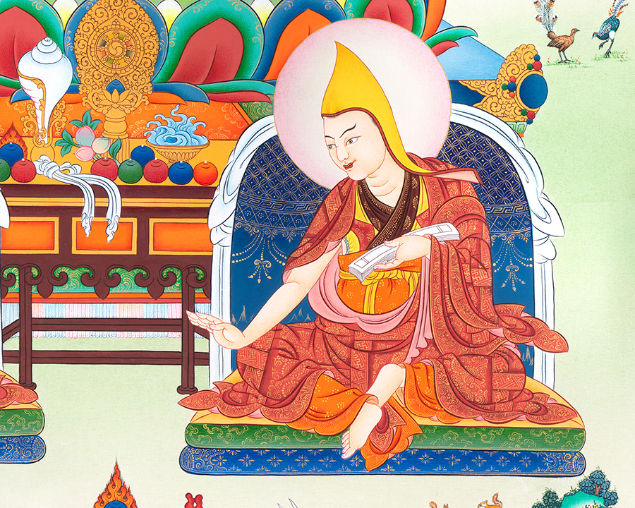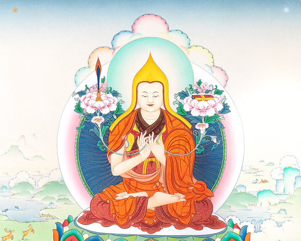 This exquisite hand-painted Je Tsongkhapa Thangka portrays the great Tibetan Buddhist master Je Tsongkhapa, the revered founder of the Gelug lineage and one of the most influential scholars and meditators in Tibetan Buddhism. Known for his profound teachings on wisdom, compassion, and the path to enlightenment, Je Tsongkhapa is often depicted wearing the distinctive yellow hat of the Gelug tradition.