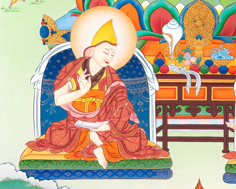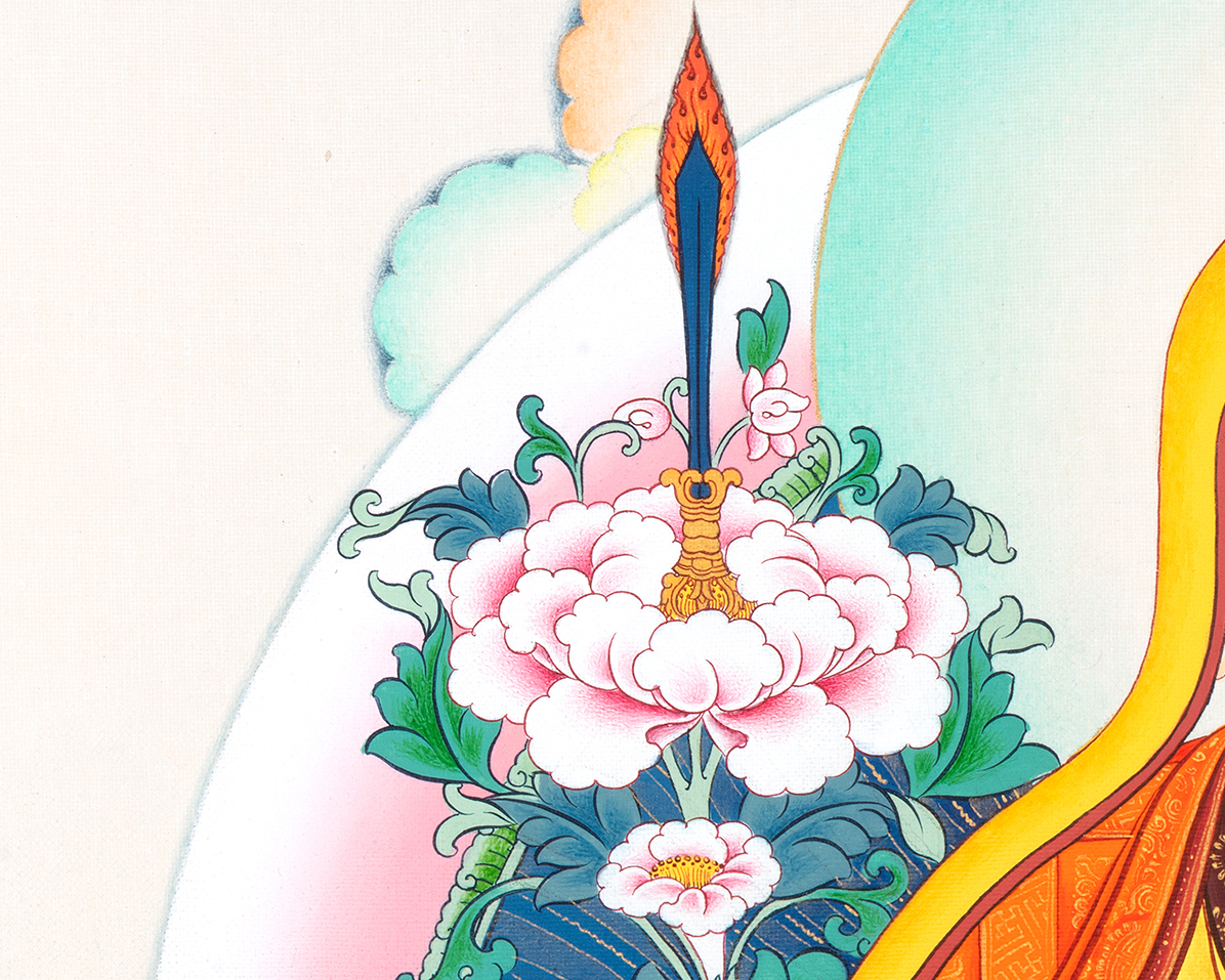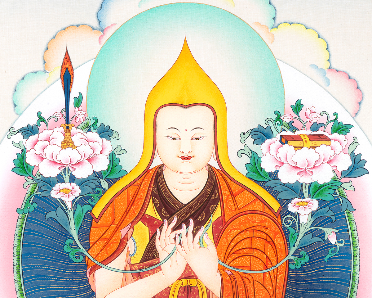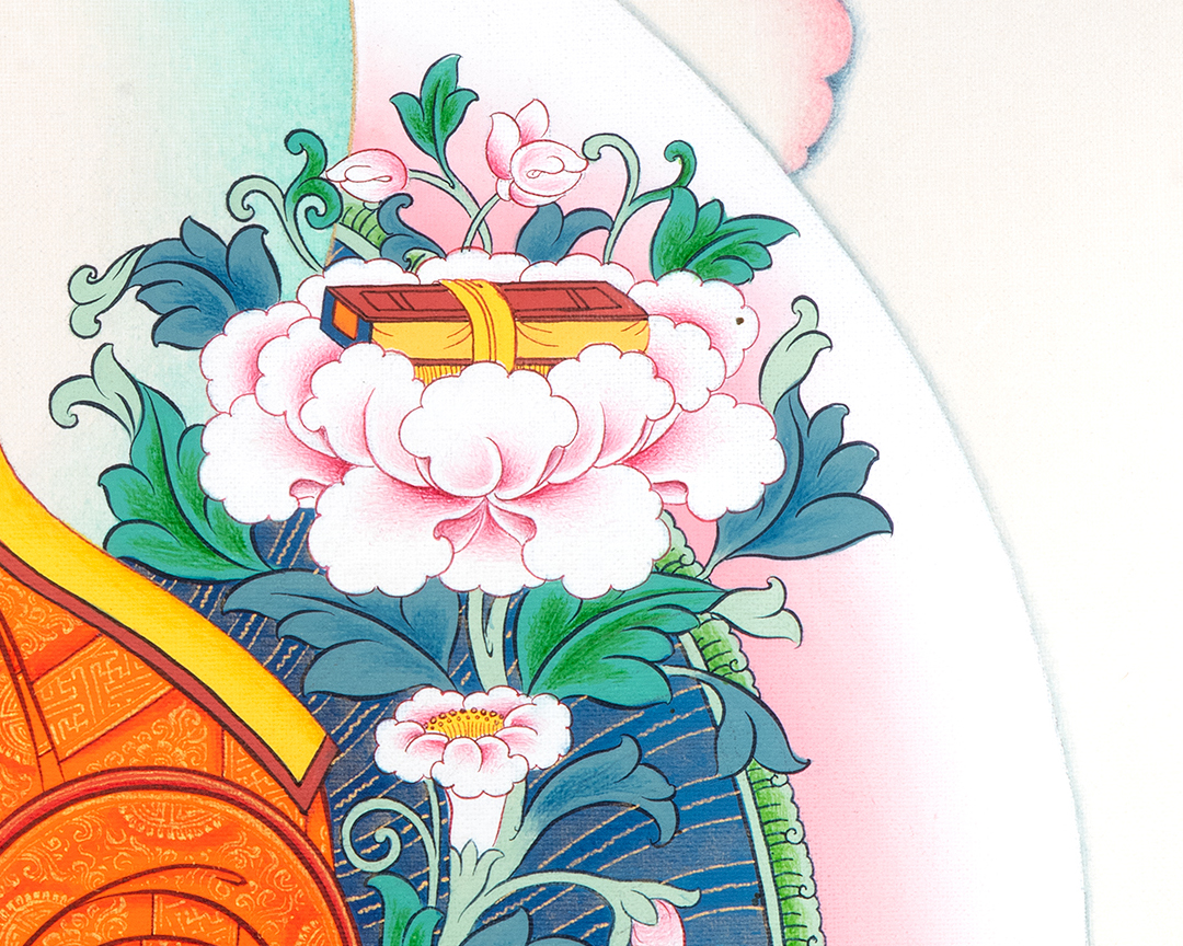In this sacred composition, Je Tsongkhapa is seated on a lotus throne symbolizing purity and spiritual awakening. He holds the stems of lotus flowers, supporting the sword of wisdom and the Prajnaparamita scripture, representing the realization of ultimate truth and the perfection of wisdom. These symbolic elements reflect the deep philosophical teachings he transmitted to countless practitioners.