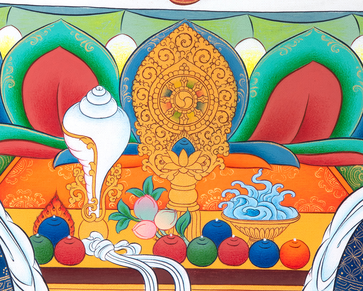 This authentic Tibetan thangka is meticulously hand-painted by skilled Himalayan artists using traditional techniques, natural mineral pigments, and fine gold detailing. Every line and color follows classical iconographic proportions preserved for centuries within the Himalayan artistic tradition.