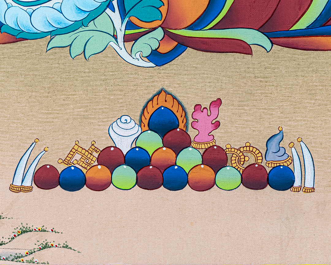 P.S. All thankas are painted taking references from Buddhist books following the correct iconography and by master artists, making it authentic traditional handmade Tibetan art. The subtle facial expression is one factor to distinguish the real effort put into creating this masterpiece.