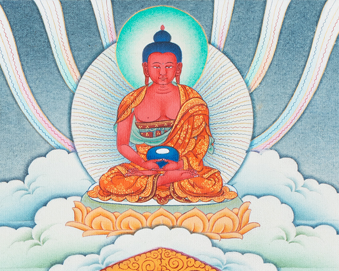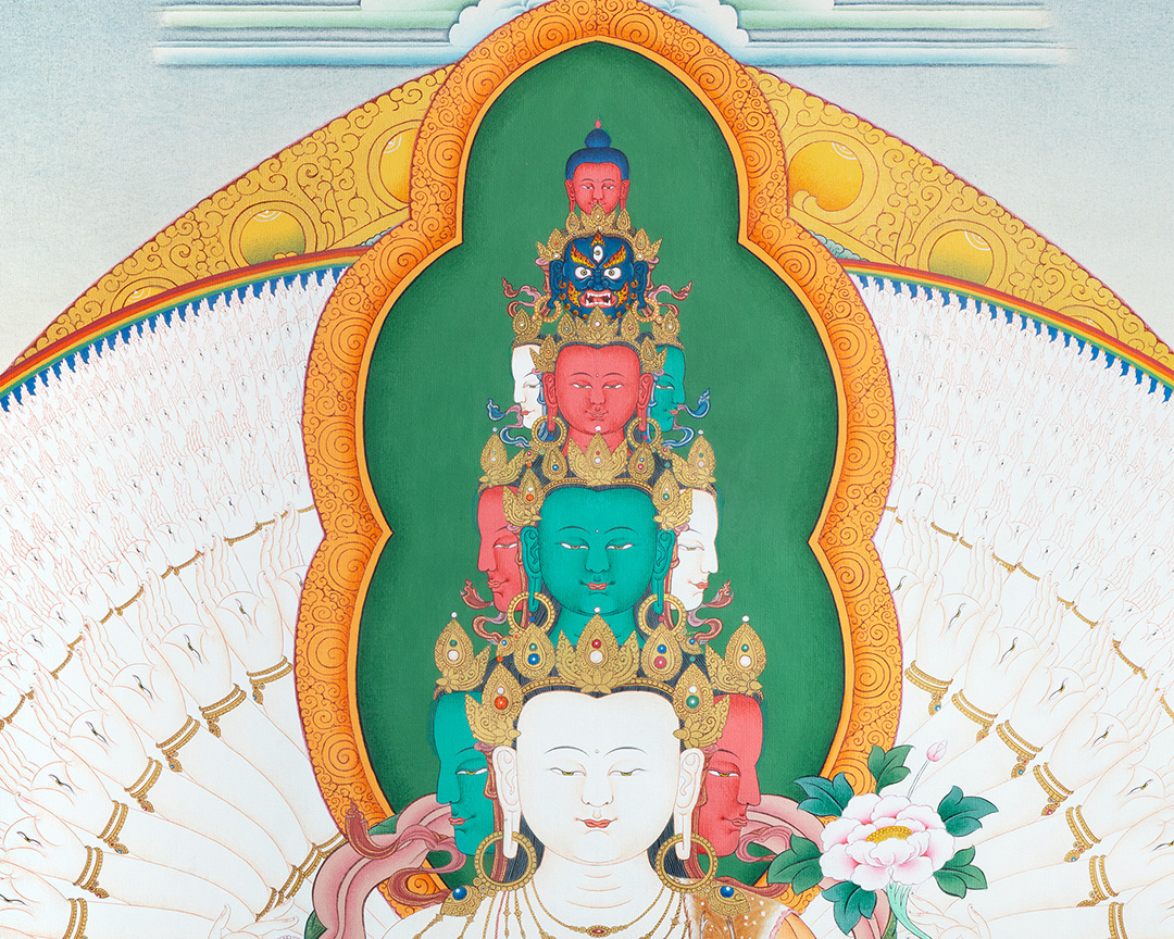 Theeleven headsrepresent the expanding levels of compassion and wisdom, rising all the way up to the peaceful, all-knowing head ofAmitabha Buddha, his spiritual guide. Thethousand armsradiate around his body like a halo of compassionate activity. Each palm holds aneye, known as the “Eye of Compassion,” signifying his ability to see the pain of every sentient being in all realms of existence.