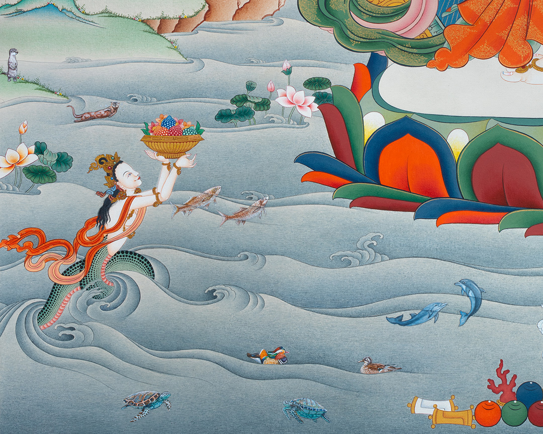 Chenrezig’s main pair of hands joins at the heart in theprayer gesture (anjali mudra), holding a radiantwish-fulfilling jewel, symbolizing pure loving-kindness. Other hands hold sacred objects such as thelotus,mala beads, and avase of nectar, each representing enlightened qualities and the power to dispel suffering.