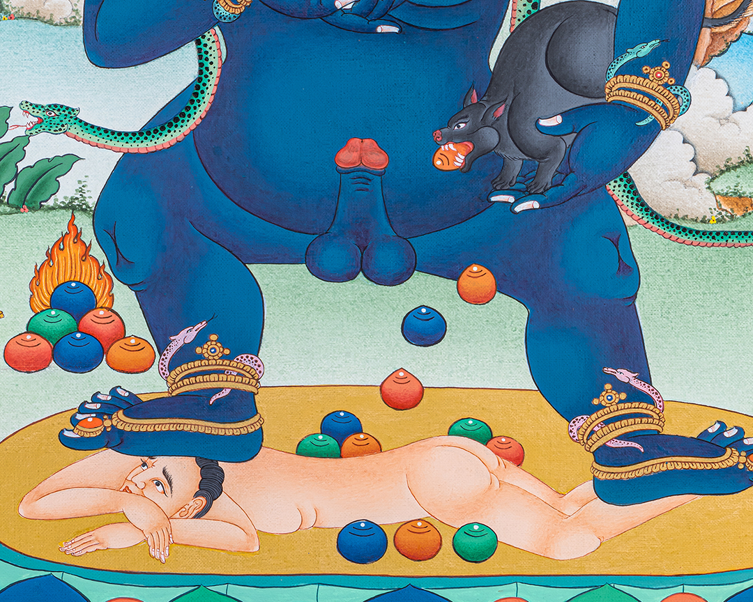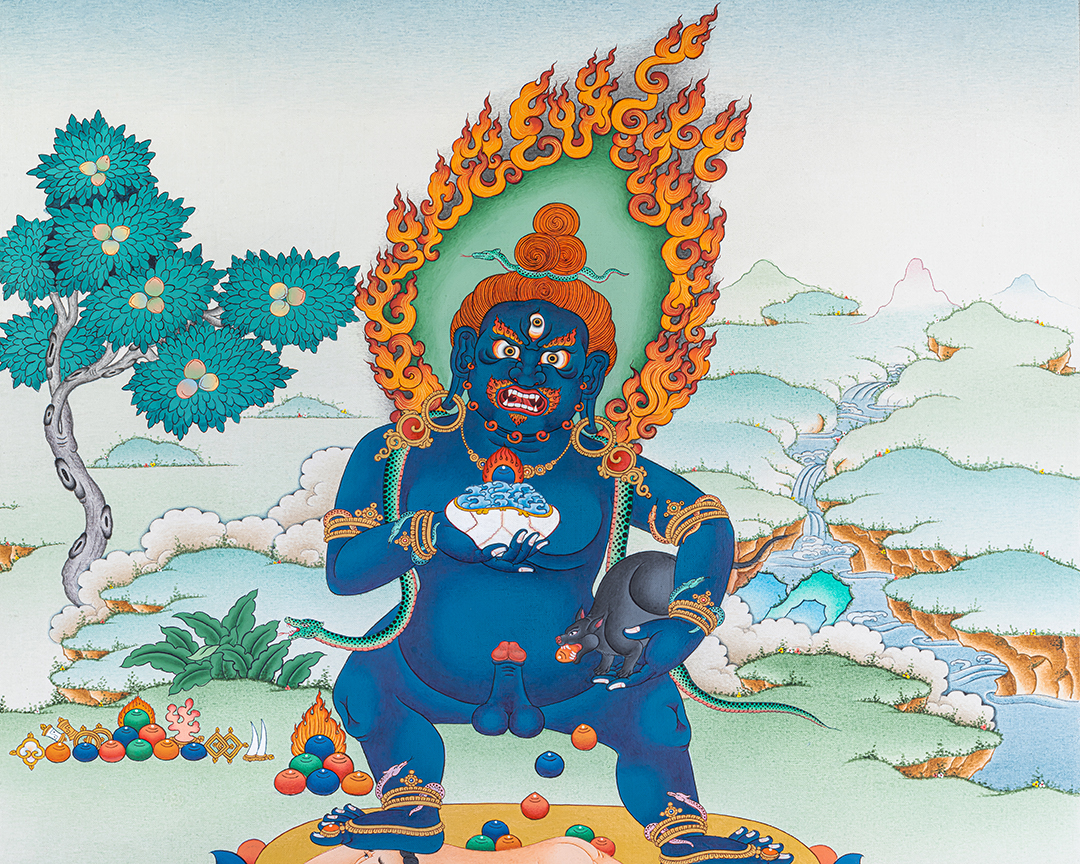 The Black Dzambala Thangka depicts Black Dzambala (Kuber), the powerful Buddhist deity associated with wealth, prosperity, and the removal of poverty caused by negative karma. Unlike ordinary wealth symbols, Black Dzambala represents spiritual wealth combined with material abundance, granted through compassion and right intention.