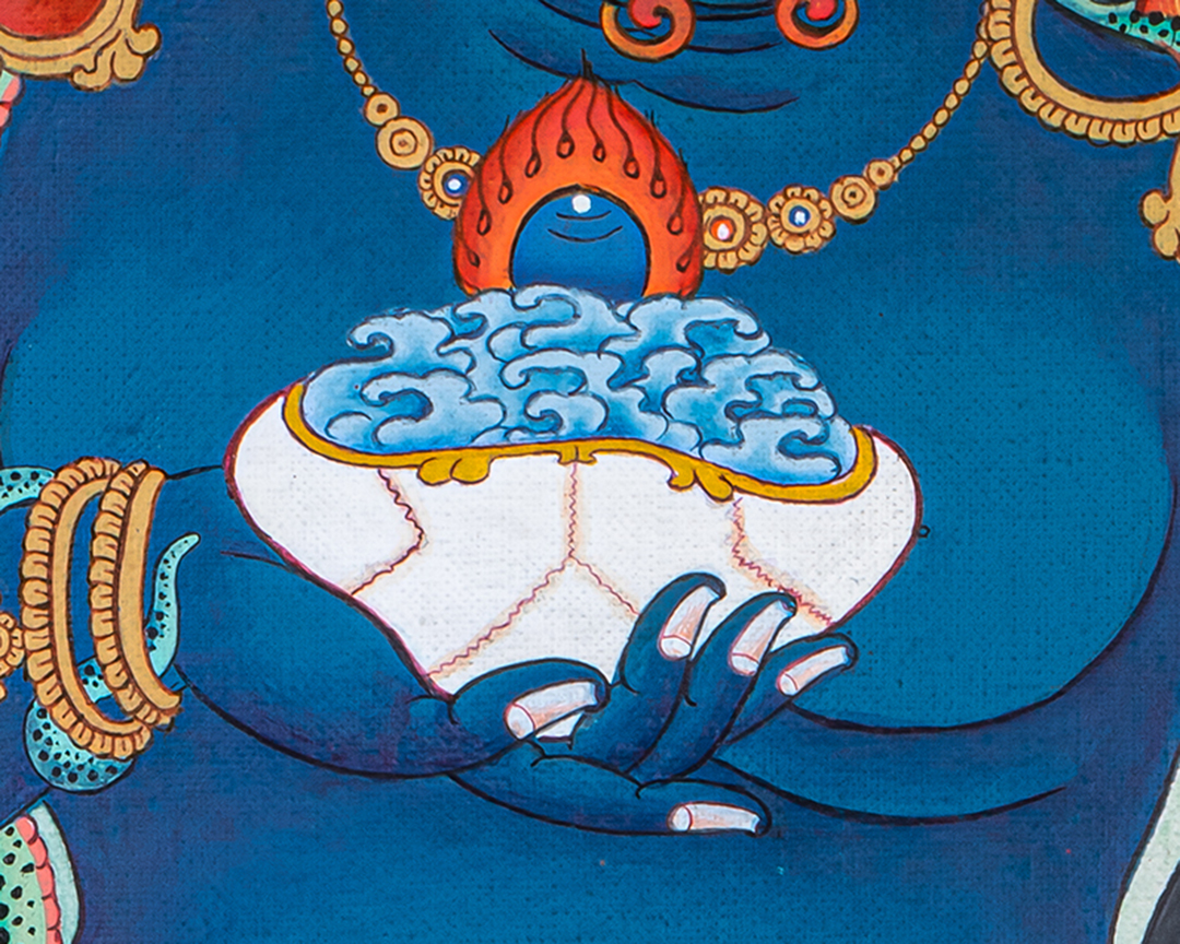 Black Dzambala is shown in a dynamic posture, often standing or seated upon a lotus and sun disc, symbolizing fearless protection and enlightened activity. His fierce expression reflects his ability to destroy obstacles to prosperity, while his dark, powerful form signifies the absorption and transformation of negativity. He traditionally holds a mongoose, which spits jewels, representing the spontaneous flow of wealth and generosity.