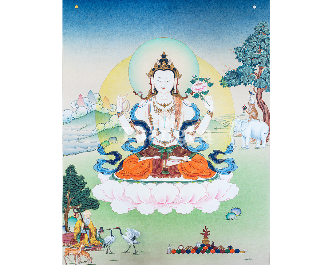 This unique Chenrezig thangka beautifully unites Tibetan Buddhist compassion with symbols of harmony and long life. At the center appears Chenrezig (Avalokiteshvara), the Bodhisattva of Infinite Compassion, radiating calm presence and unconditional loving-kindness. His serene form serves as a spiritual anchor, reminding practitioners of compassion as the foundation of all virtuous qualities.