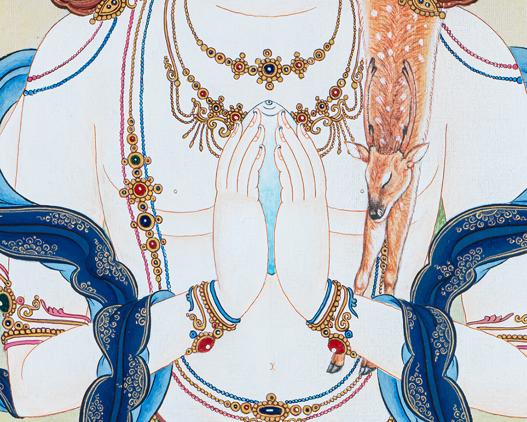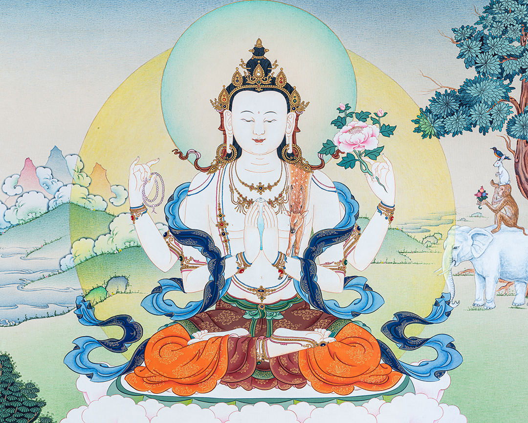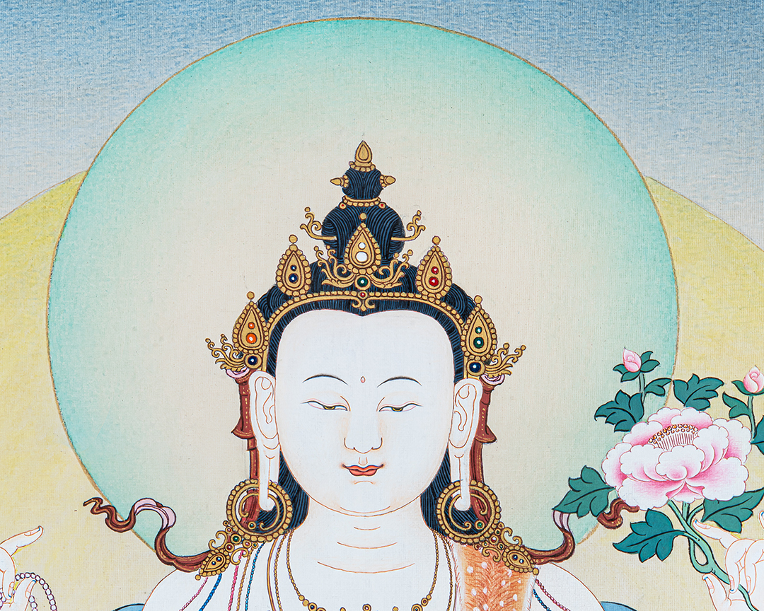 Ideal for home shrines, meditation rooms, or as an auspicious gift, this Chenrezig thangka inspires compassion, harmony, cooperation, and long life, making it a deeply symbolic addition to any sacred space.