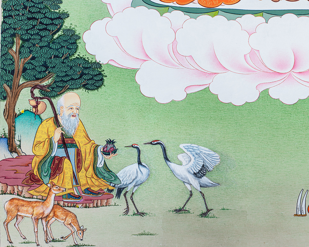 Also featured is Shou-Lao, the Chinese God of Longevity, traditionally depicted as an elderly sage associated with long life, wisdom, and good fortune. His presence adds an auspicious layer of meaning, symbolizing health, longevity, and the blessings of a long, meaningful life guided by compassion and ethical living.