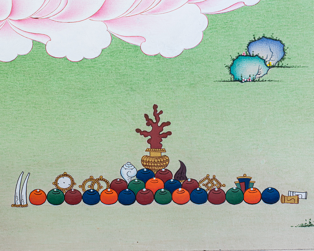 P.S. All thankas are painted taking references from Buddhist books following the correct iconography and by master artists, making it authentic traditional handmade Tibetan art. The subtle facial expression is one factor to distinguish the real effort put into creating this masterpiece.