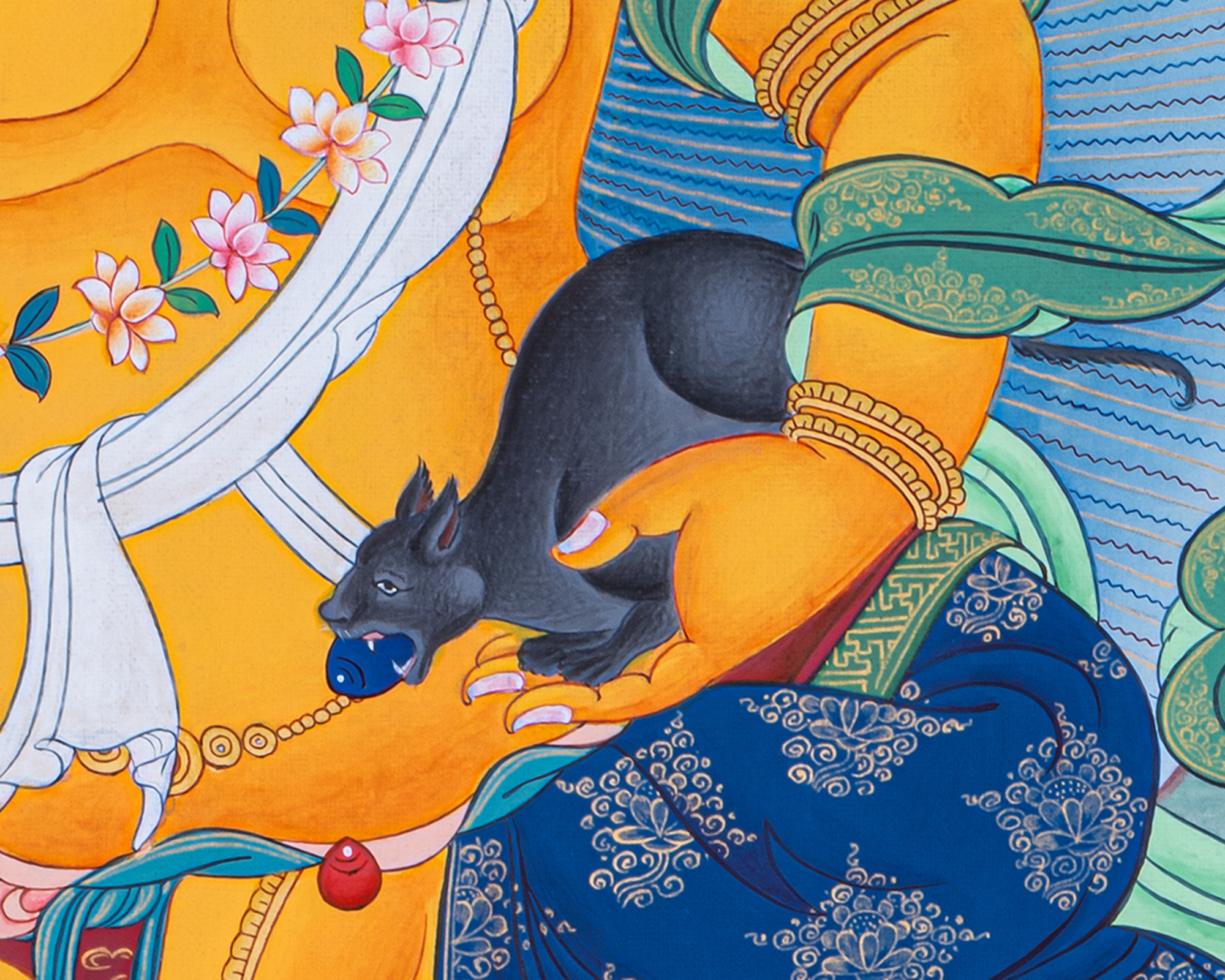 Embrace prosperity and spiritual blessings with this Dzambala Thangka, featuring the revered Tibetan Wealth Deity. Dzambala, the guardian of abundance, is beautifully depicted seated on a lotus throne, holding his iconic treasure mongoose that symbolizes generosity and wealth.