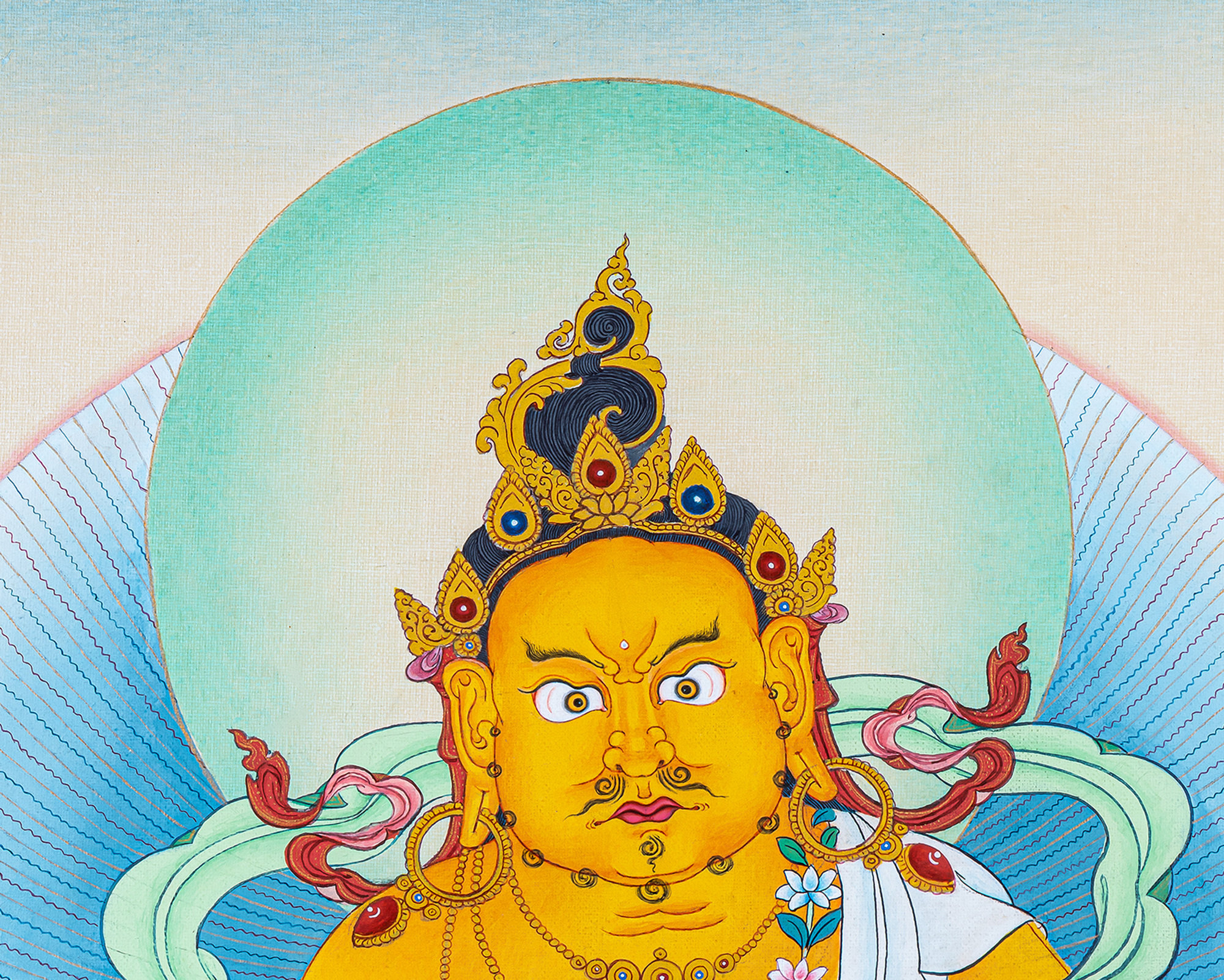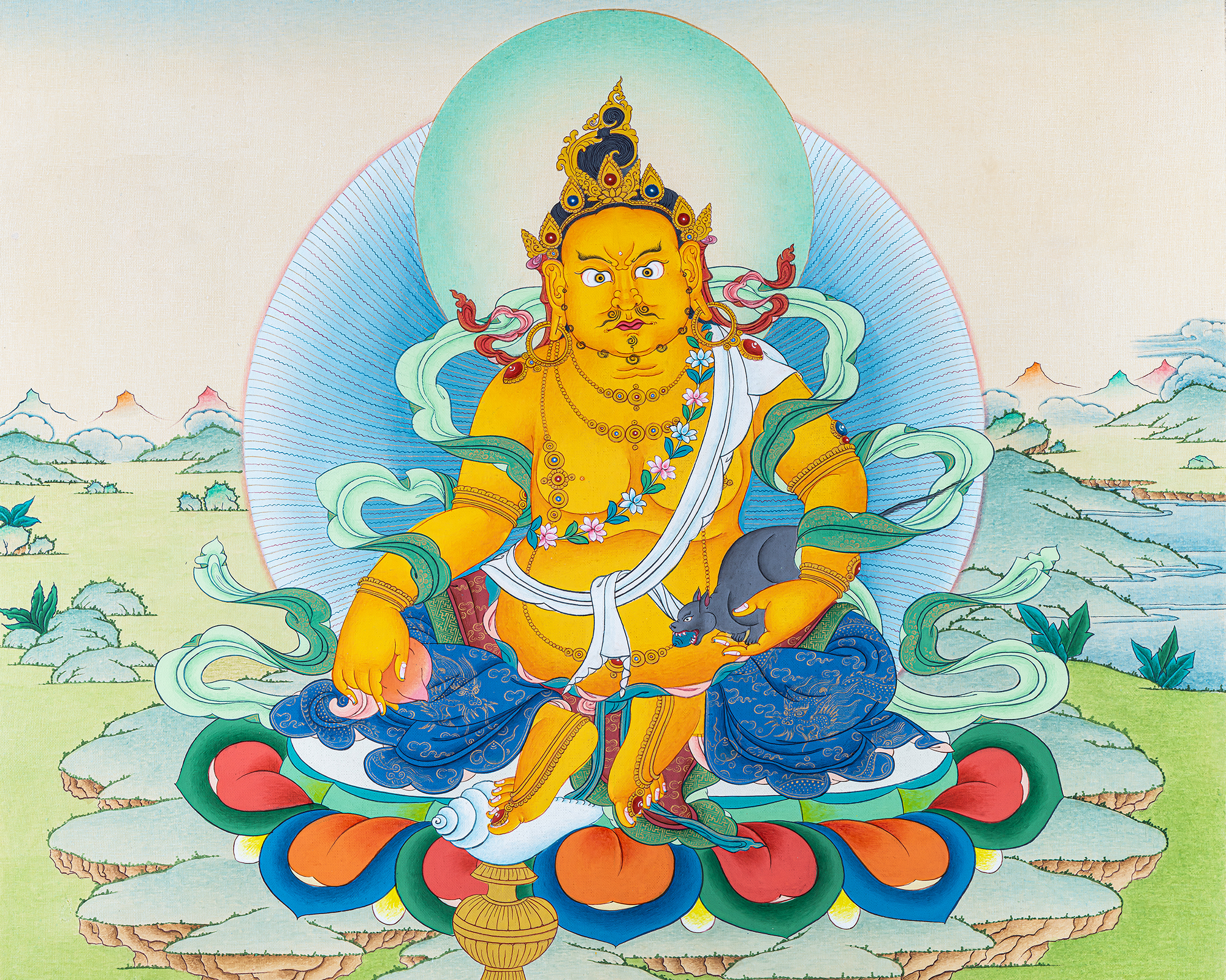 Enhance your spiritual practice and invite abundance with this Dzambala Thangka, depicting the Tibetan Wealth Deity seated on a lotus throne. Dzambala holds the treasure mongoose, a symbol of generosity and the removal of poverty.
