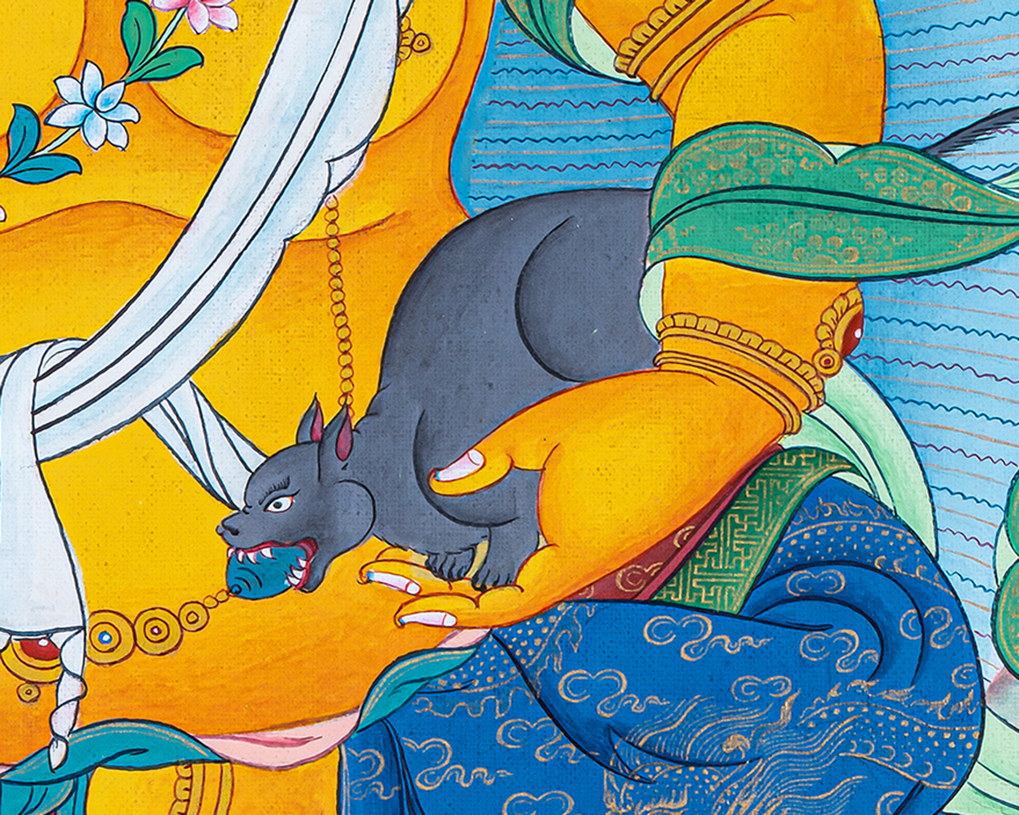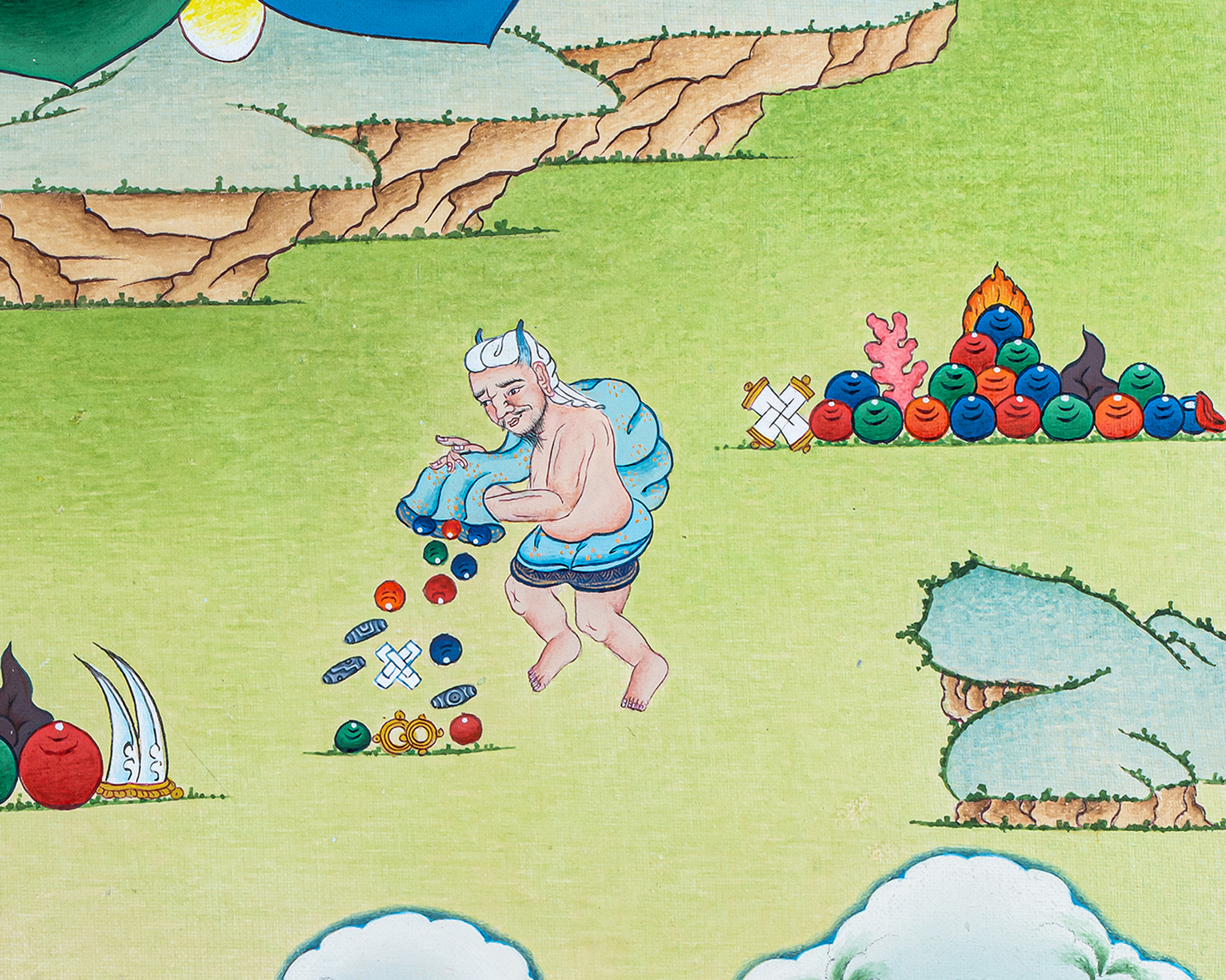 This hand-painted thangka uses traditional Tibetan techniques and vibrant natural pigments, making it not only a sacred tool for meditation and rituals but also a stunning piece of home décor. Perfect for devotees seeking prosperity, good fortune, and spiritual blessings, this thangka brings both beauty and positive energy into any space.