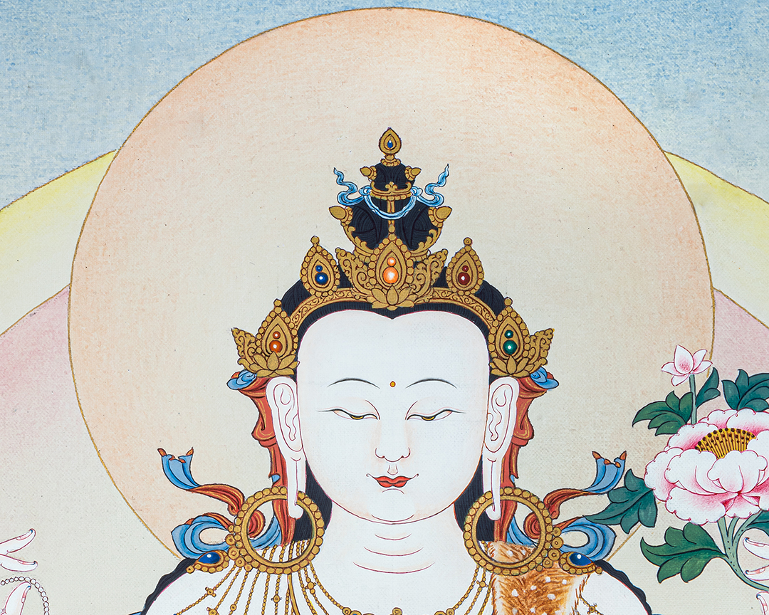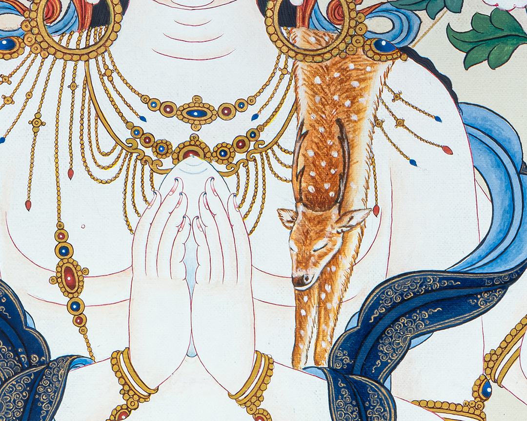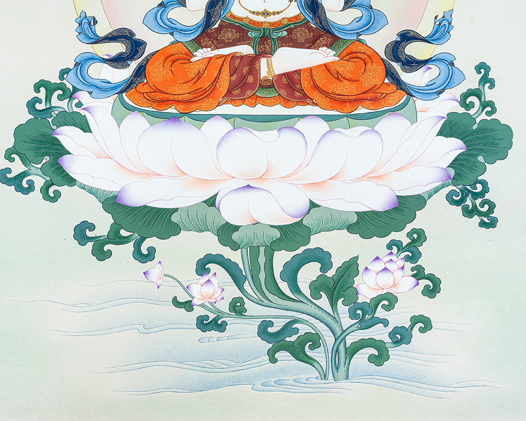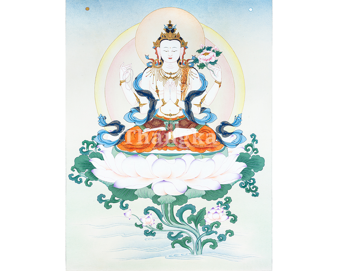 This exquisite thangka depicts Four-Armed Chenrezig (Avalokiteshvara), the Bodhisattva of Infinite Compassion, seated gracefully upon a fully bloomed lotus (Pema) rising from serene waters. His luminous white body symbolizes purity, clarity, and unconditional compassion, while his calm and gentle expression radiates inner peace and loving-kindness. Chenrezig’s two principal hands are joined at the heart in Anjali Mudra, holding a wish-fulfilling jewel that represents the perfect union of wisdom and compassion. His other two hands hold a crystal mala, symbolizing continuous compassionate activity for all beings, and a lotus flower, signifying purity untouched by worldly suffering. The soft pastel tones, subtle halos, and flowing silk scarves enhance the sense of serenity and divine presence. The lotus seat, emerging from water, reflects spiritual awakening and the blossoming of compassion even within the cycle of samsara. The balanced composition and fine detailing follow traditional Tibetan thangka iconography, making this artwork both spiritually authentic and visually calming. Ideal for meditation spaces, personal shrines, or sacred interiors, this Four-Armed Chenrezig Thangka serves as a powerful support for compassion practice, mindfulness, and the recitation of Om Mani Padme Hum, while also standing as a timeless piece of sacred Himalayan art.