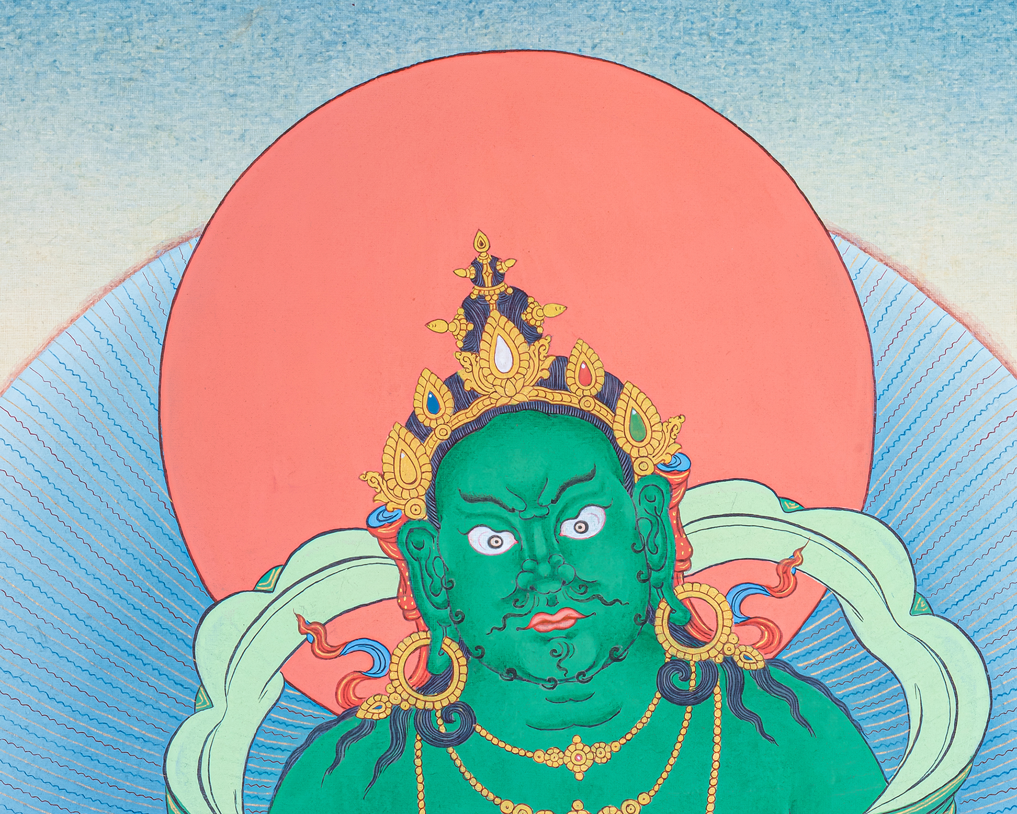The Green Dzambala Thangka is a sacred Tibetan painting depicting Dzambala, the Wealth Deity, in his green form, symbolizing growth, vitality, and abundance. Seated gracefully on a lotus throne, Green Dzambala holds the treasure mongoose that sprinkles jewels, representing the removal of poverty and the flow of wealth and prosperity.