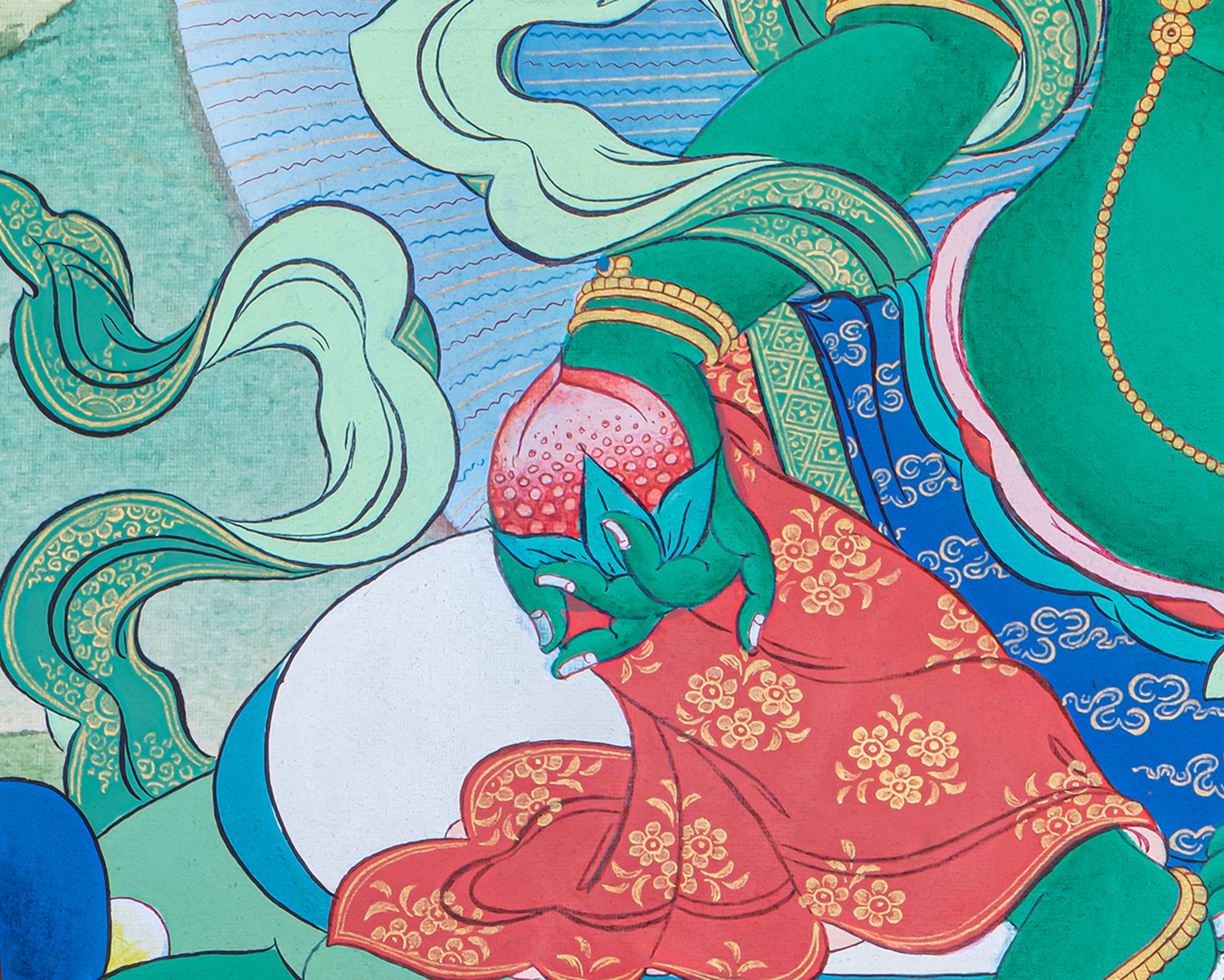 Perfect for devotees, collectors, or as a meaningful gift of blessings, this Green Dzambala Thangka not only enhances the beauty of your sacred space but also serves as a powerful symbol of abundance, prosperity, and spiritual wellbeing. Bringing it into your home is believed to invite positive energy, success, and financial stability.