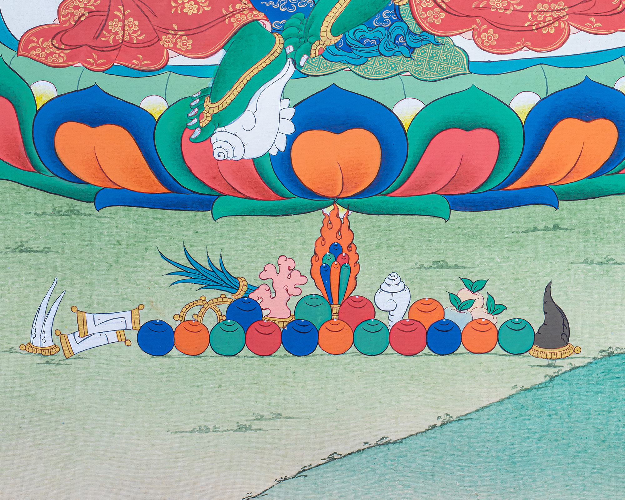 P.S. All thankas are painted taking references from Buddhist books following the correct iconography and by master artists, making it authentic traditional handmade Tibetan art. The subtle facial expression is one factor to distinguish the real effort put into creating this masterpiece.