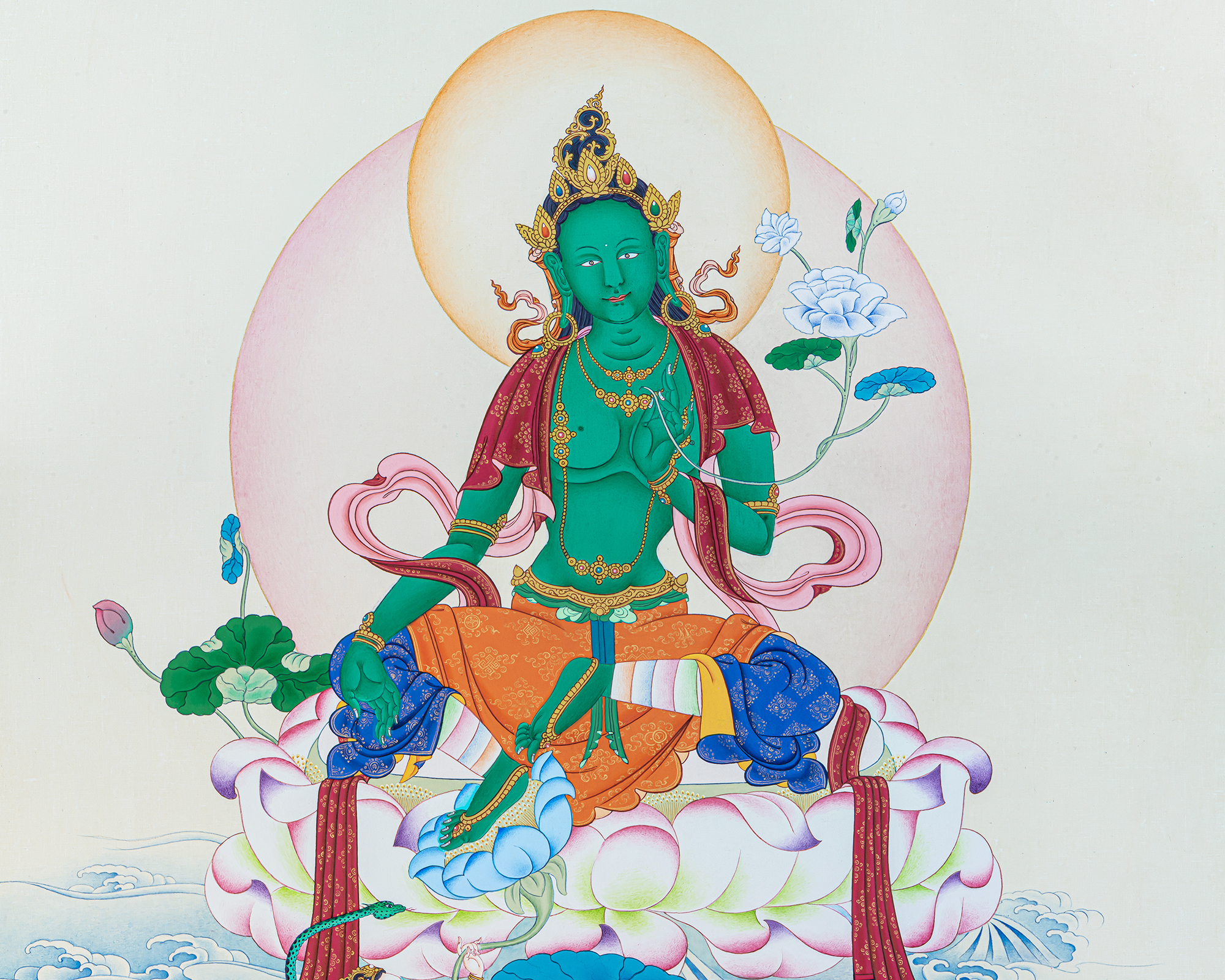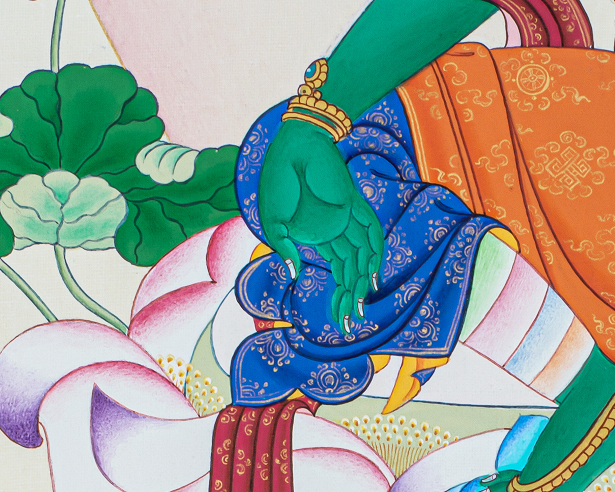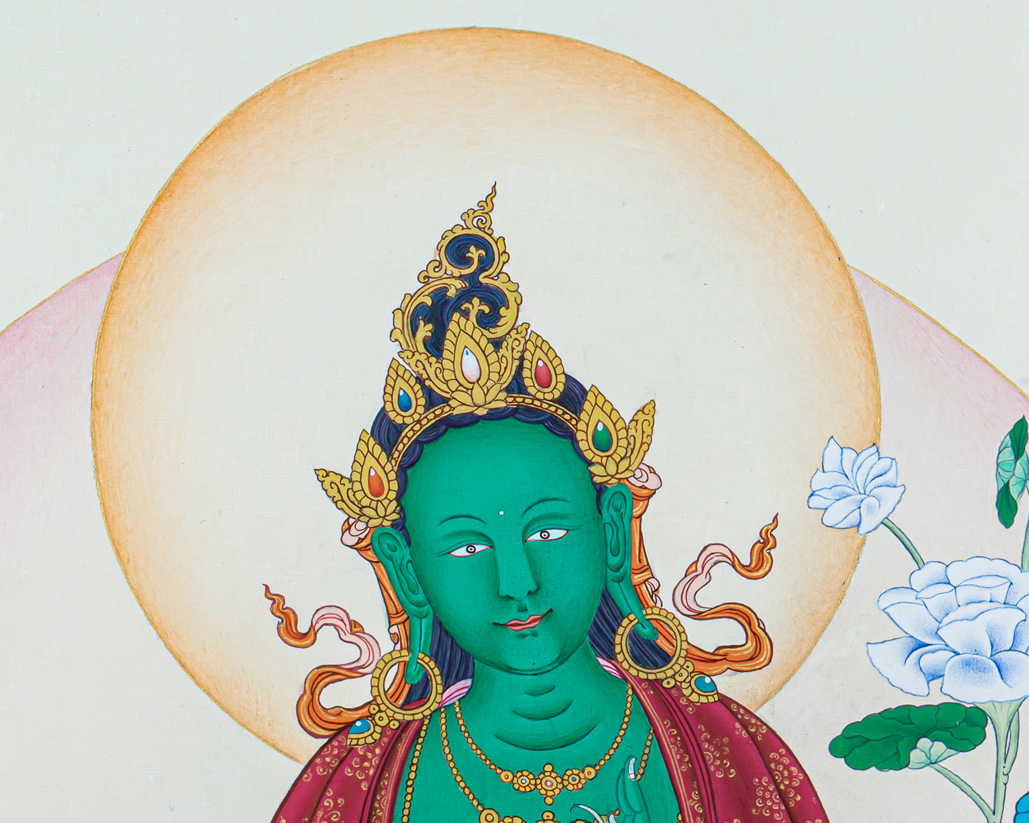 Crafted by skilled Tibetan artisans using traditional painting techniques and vibrant natural pigments, this thangka captures every detail of Green Tara’s serene expression, delicate hand gestures (mudras), and lotus seat. It serves as a powerful tool for meditation, altar offerings, spiritual practice, or sacred décor, helping devotees cultivate courage, compassion, and spiritual wisdom.