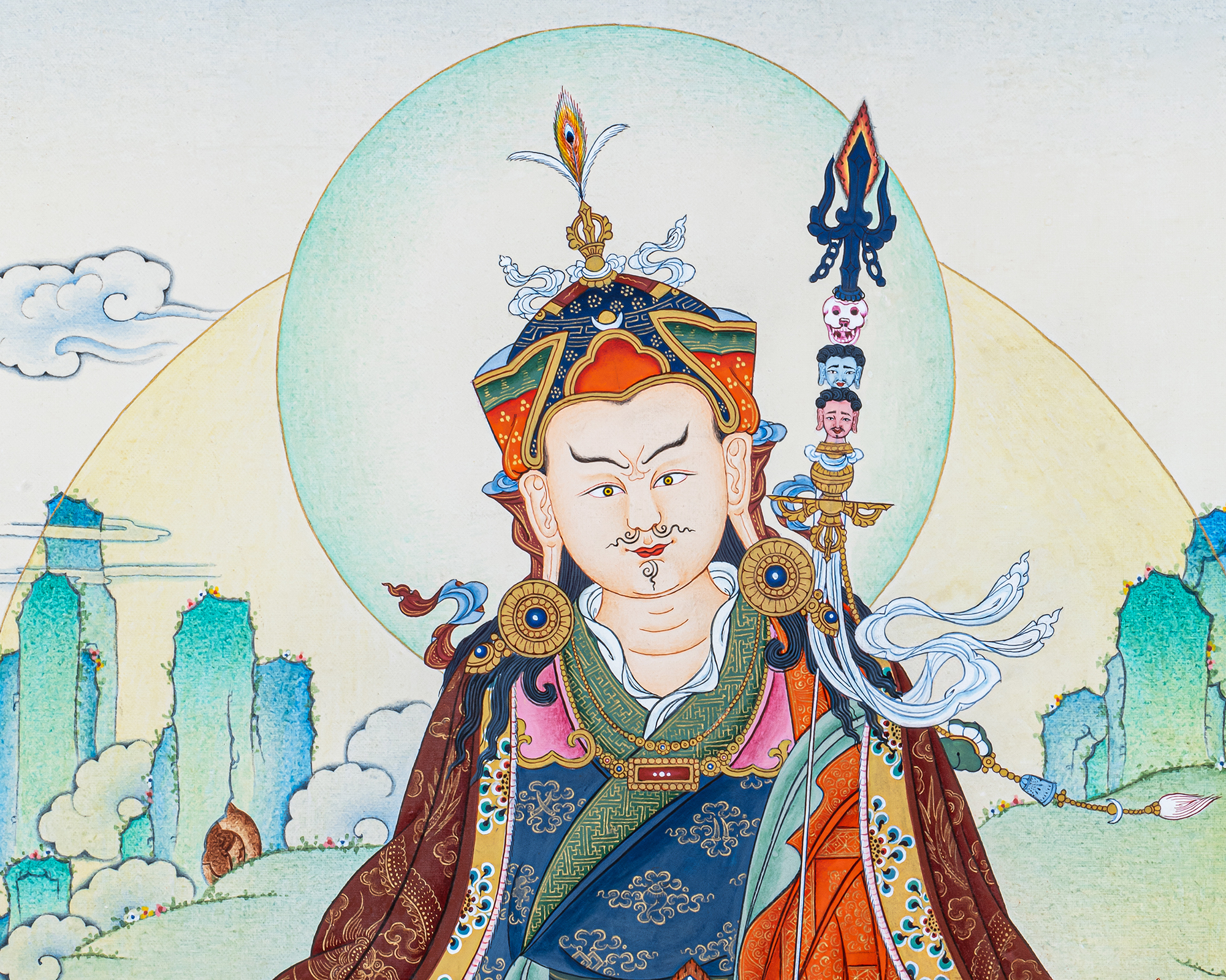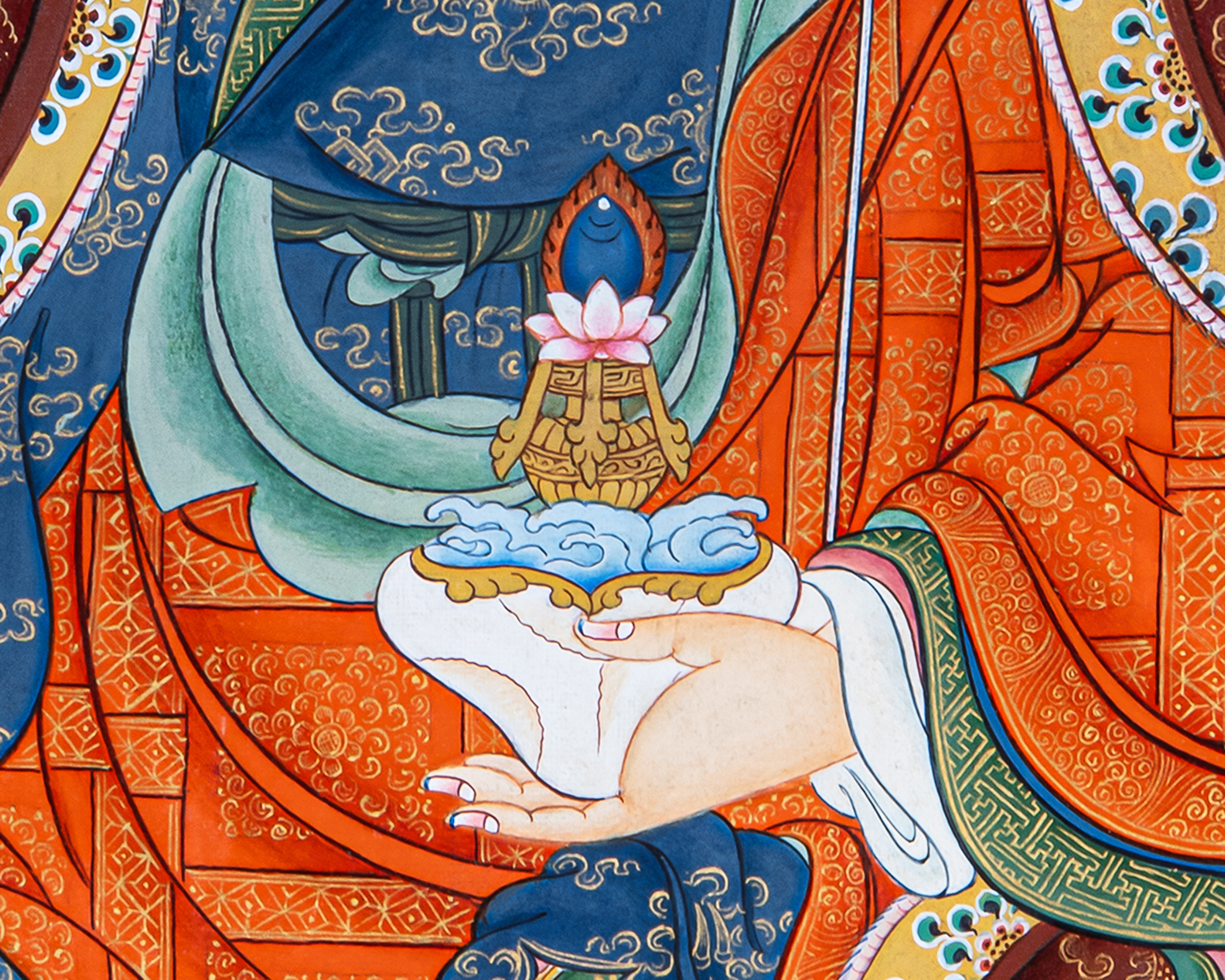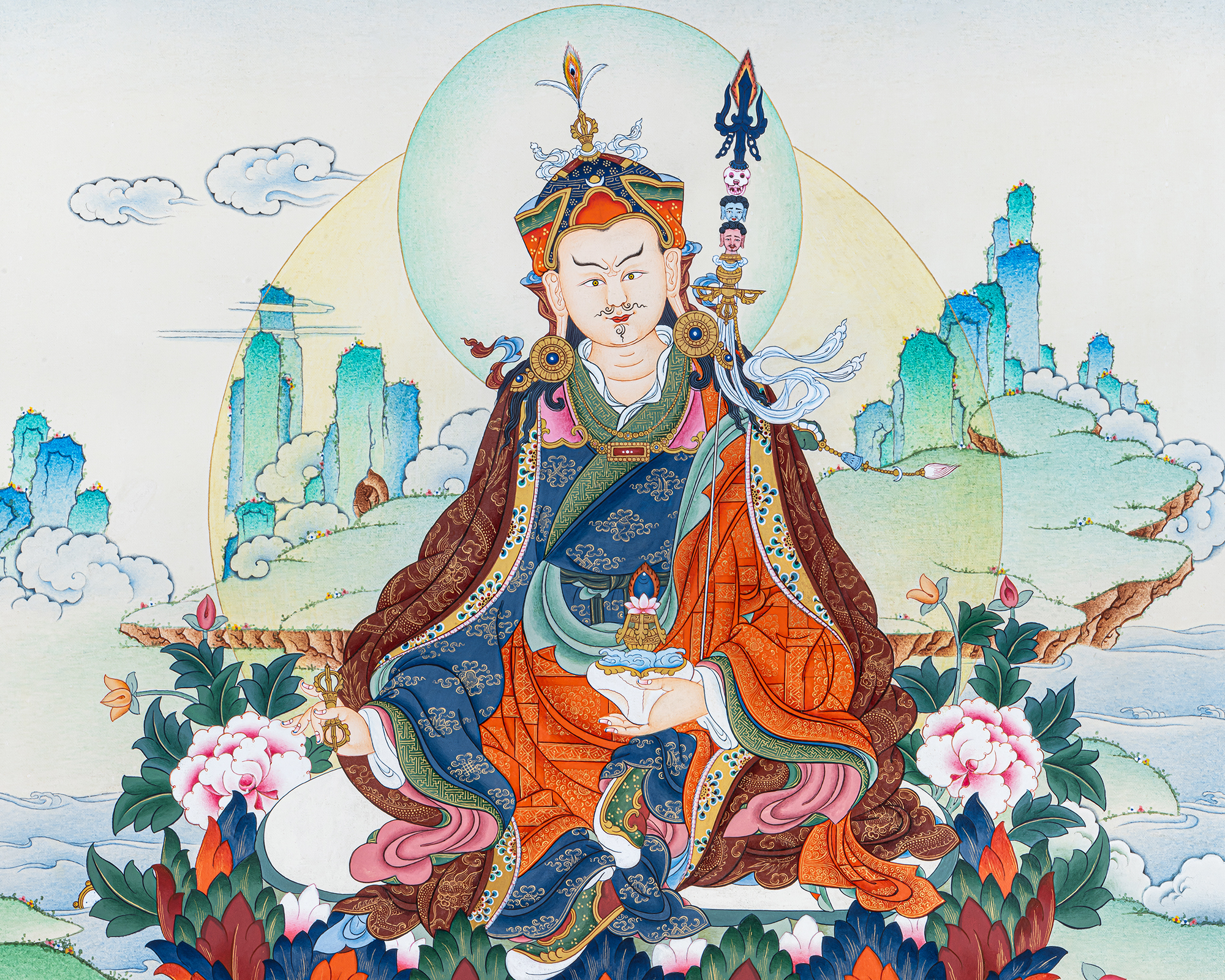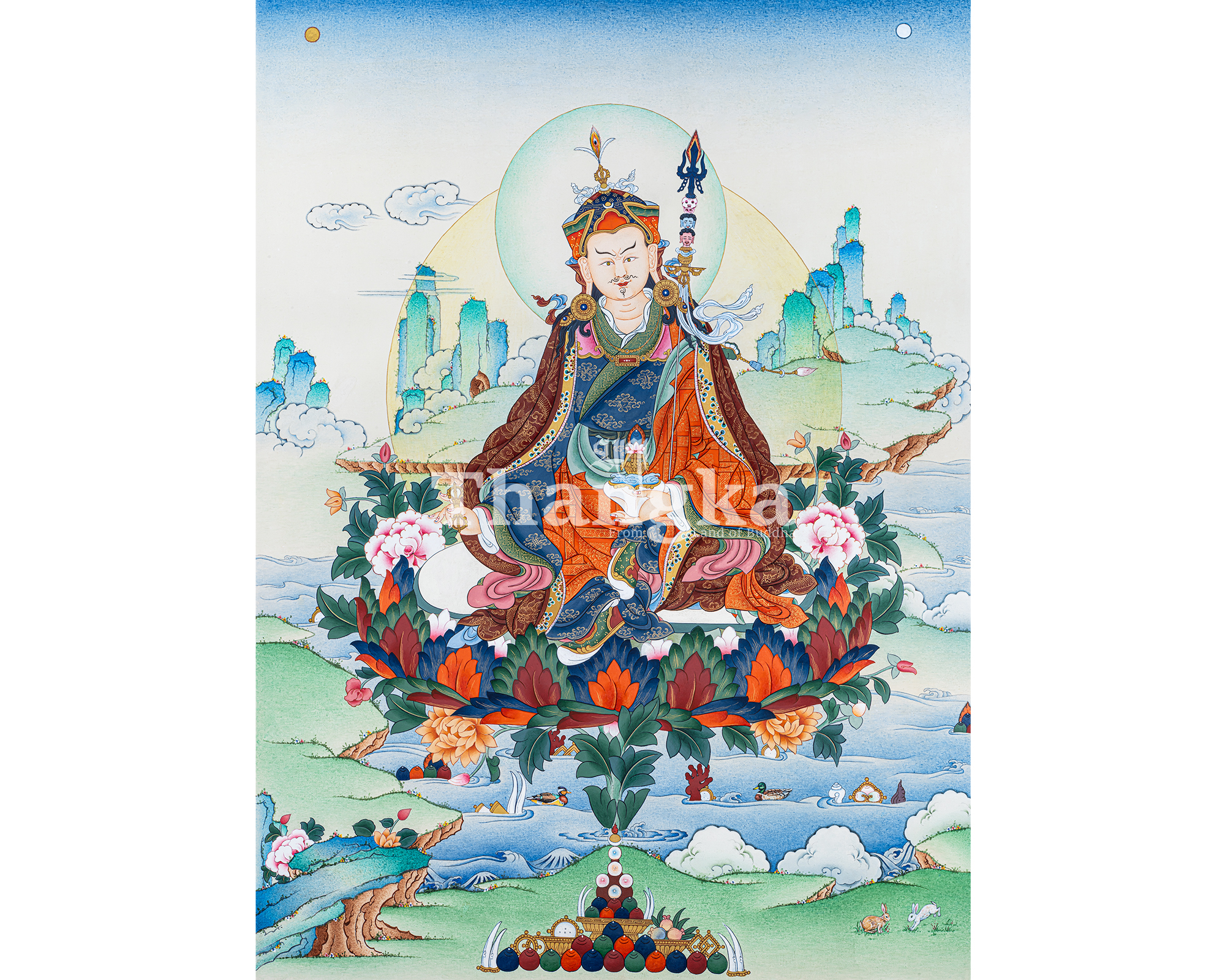 This serene Guru Rinpoche Thangka illustrates Padmasambhava, the Lotus-Born master who spread Vajrayana Buddhism throughout the Himalayan regions. Seated gracefully on a fully blossomed lotus, Guru Rinpoche embodies awakened awareness beyond duality. He holds the vajra as a symbol of indestructible wisdom and the skull cup filled with the nectar of realization, while the sacred khatvanga staff rests against his shoulder, signifying the union of compassion and skillful means.