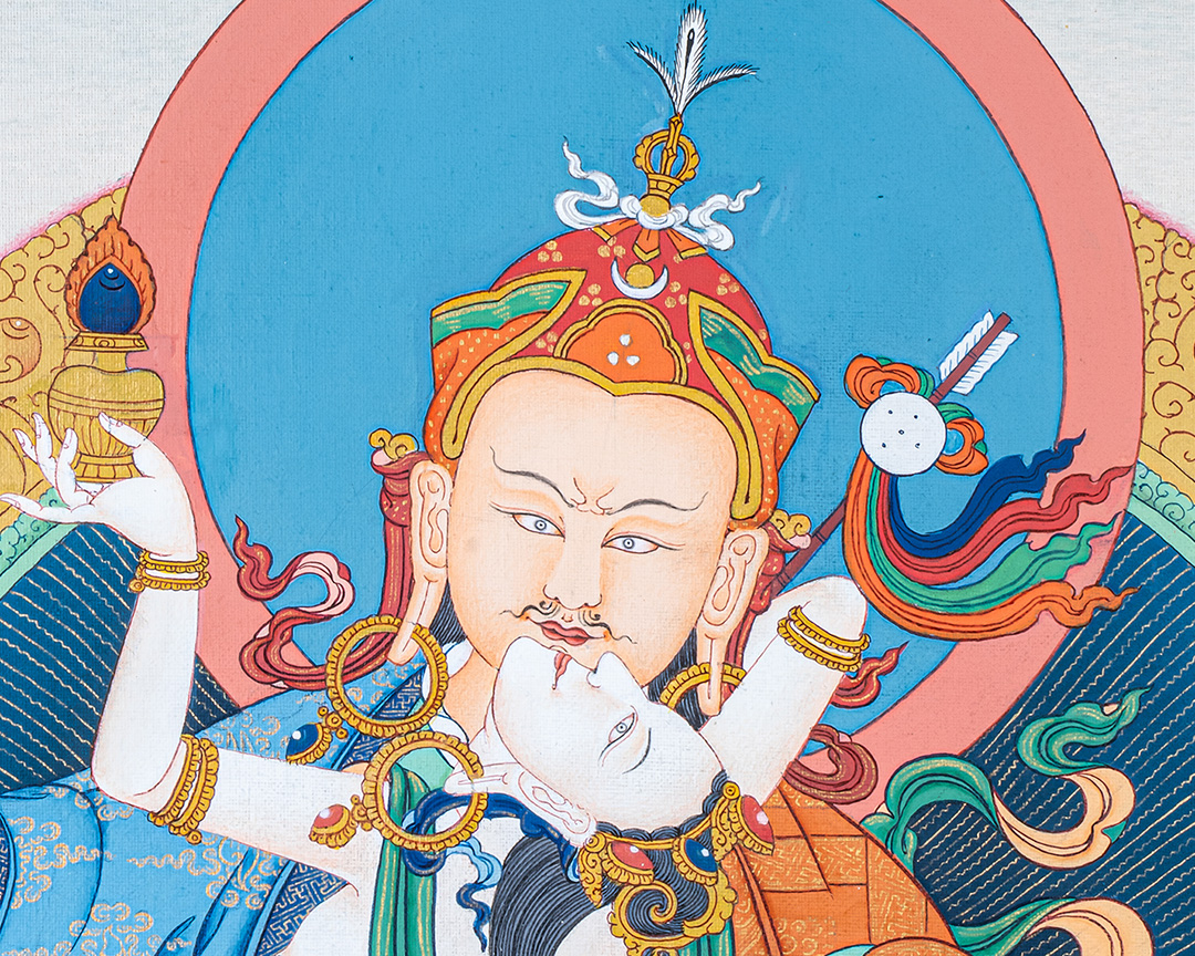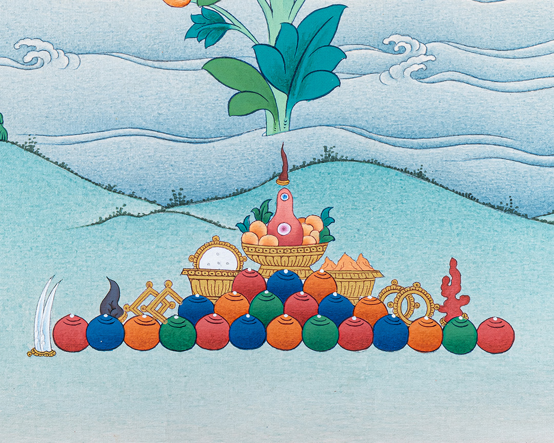 In this divine form, Guru Rinpoche sits in royal ease, radiating confidence and compassion. He holds the vajra, representing unshakable truth, and the skull cup, filled with the nectar of timeless wisdom. Resting against his shoulder, the Khatvanga signifies his mastery of the tantric teachings and the presence of the enlightened feminine. By his side, his consort—often depicted as Yeshe Tsogyal, the embodiment of pure wisdom—appears in graceful poise, adorned with celestial ornaments and holding symbolic implements that represent clarity, devotion, and the realization of the ultimate nature. Her serene yet powerful presence completes the sacred mandala of blessings.