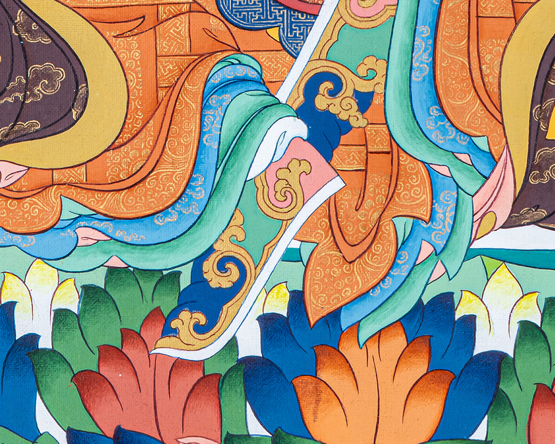 Together, Guru Rinpoche and his consort emanate a field of protection, empowerment, and spiritual awakening. Their imagery reminds practitioners that enlightenment arises through the perfect balance of compassion and wisdom. Placing this sacred depiction in your home or meditation space invites profound blessings, inner transformation, and the courage to walk the path of truth with an open, fearless heart.