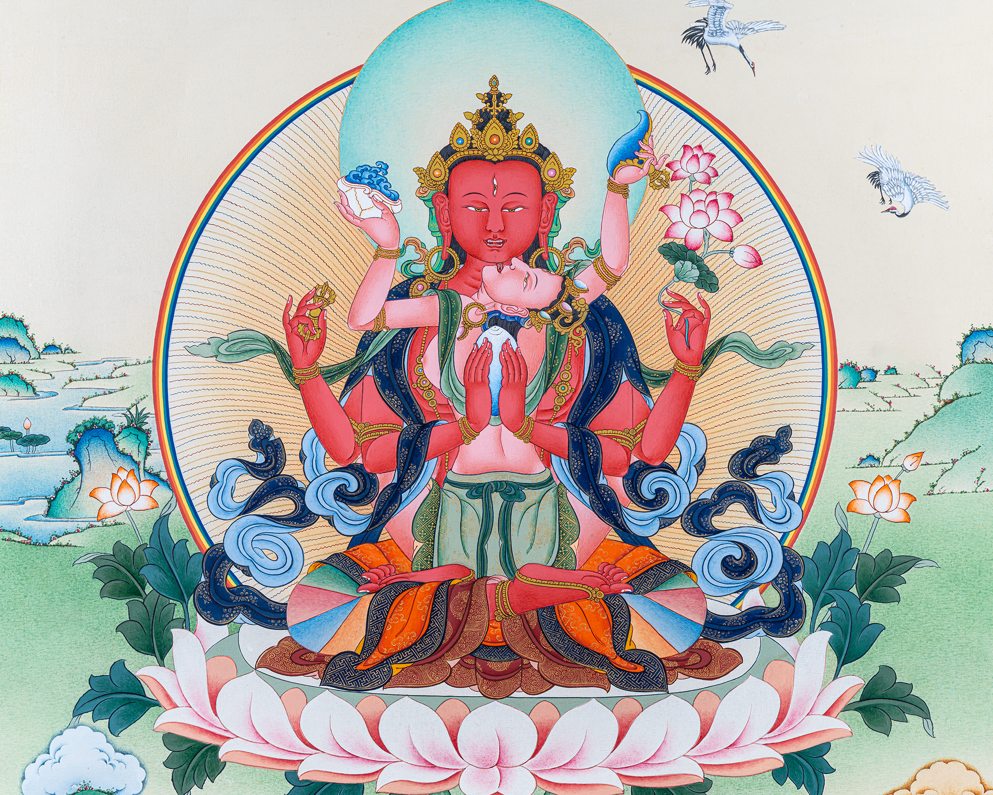 This exquisite Gyalwa Gyatso Thangka depicts the blissful and radiant form of Avalokiteshvara, the Bodhisattva of Compassion, revered in Vajrayana Buddhism as the embodiment of great bliss, wisdom, and compassionate power. Shown in union form, Gyalwa Gyatso symbolizes the perfect harmony of wisdom and skillful means, revealing the profound tantric path that transforms desire into awakening.