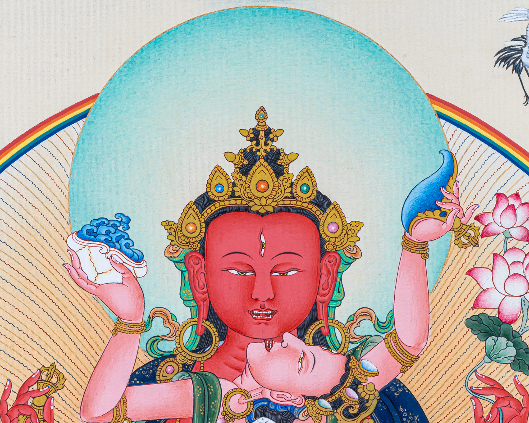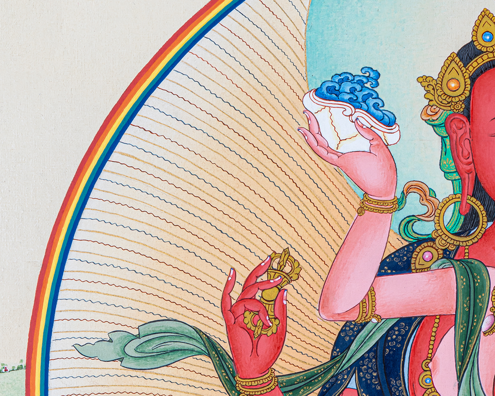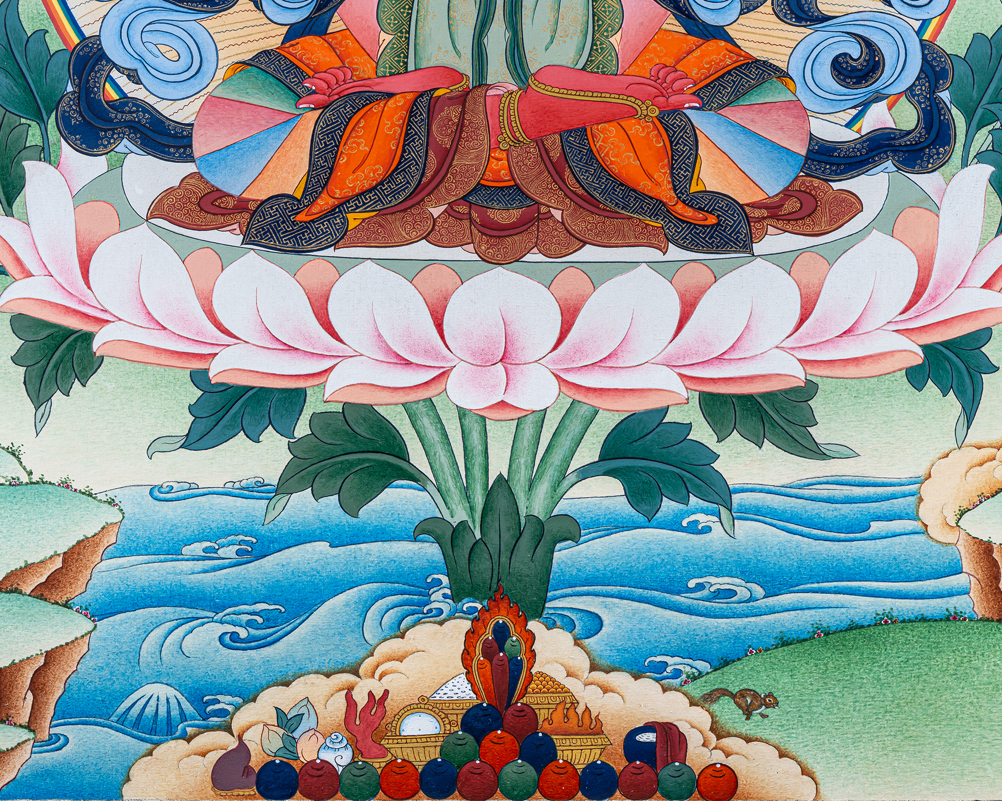 P.S. All thankas are painted taking references from Buddhist books following the correct iconography and by master artists, making it authentic traditional handmade Tibetan art. The subtle facial expression is one factor to distinguish the real effort put into creating this masterpiece.