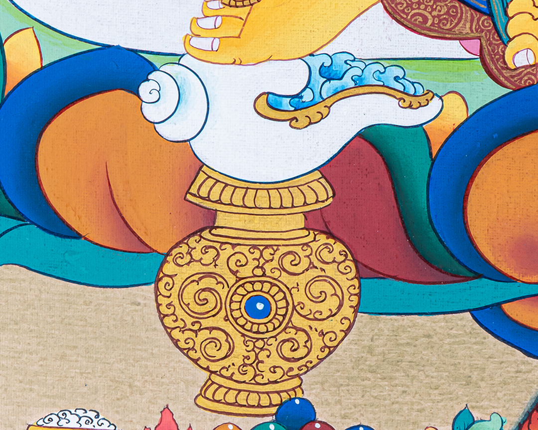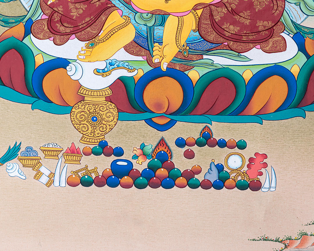 P.S. All thankas are painted taking references from Buddhist books following the correct iconography and by master artists, making it authentic traditional handmade Tibetan art. The subtle facial expression is one factor to distinguish the real effort put to create this masterpiece.