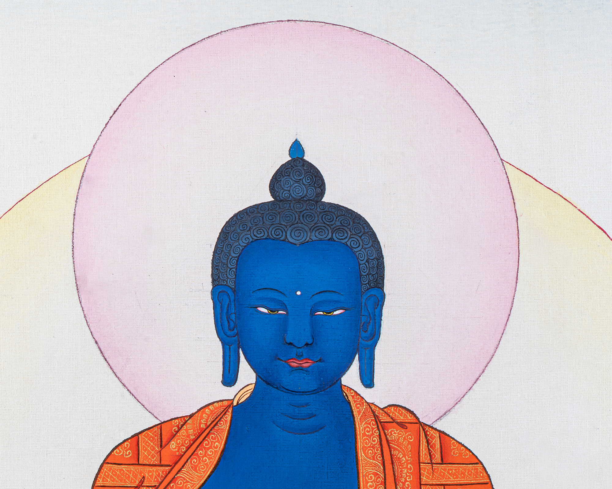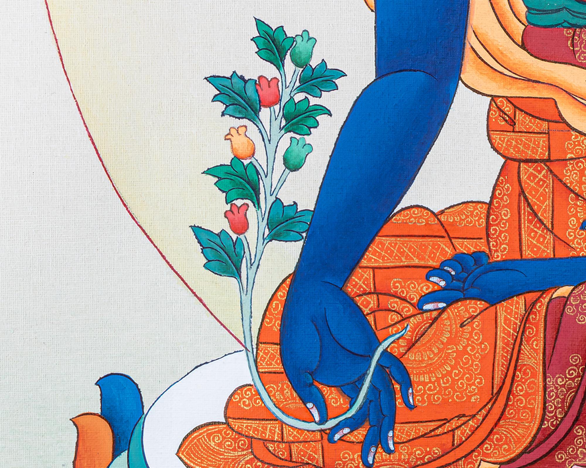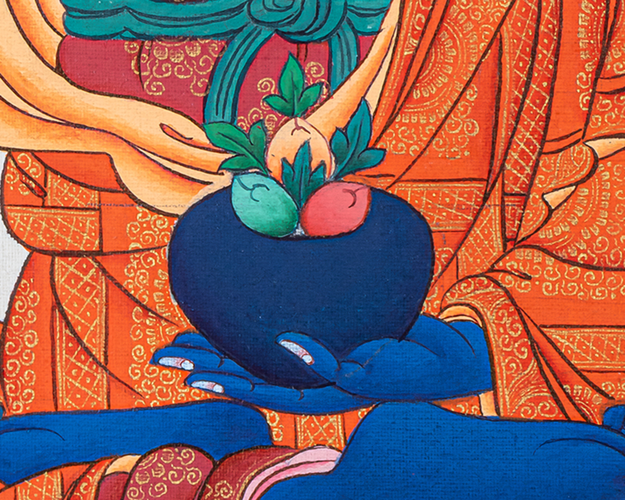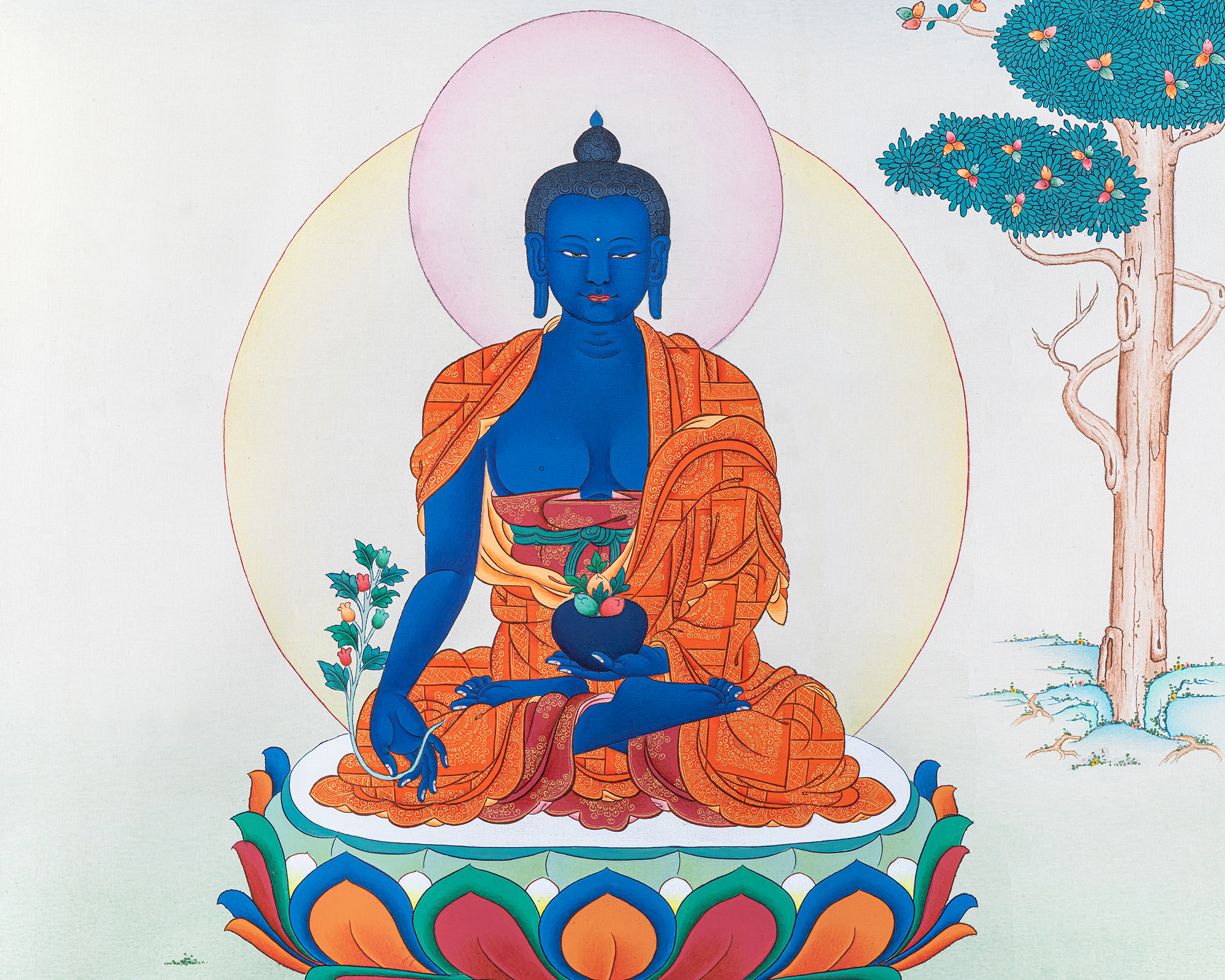 In traditional iconography, Medicine Buddha holds the myrobalan plant in his right hand, symbolizing the perfect remedy, and a bowl of healing nectar in his left, representing the Dharma as the ultimate medicine. His presence reminds practitioners that true healing arises from both outer treatment and inner transformation.
